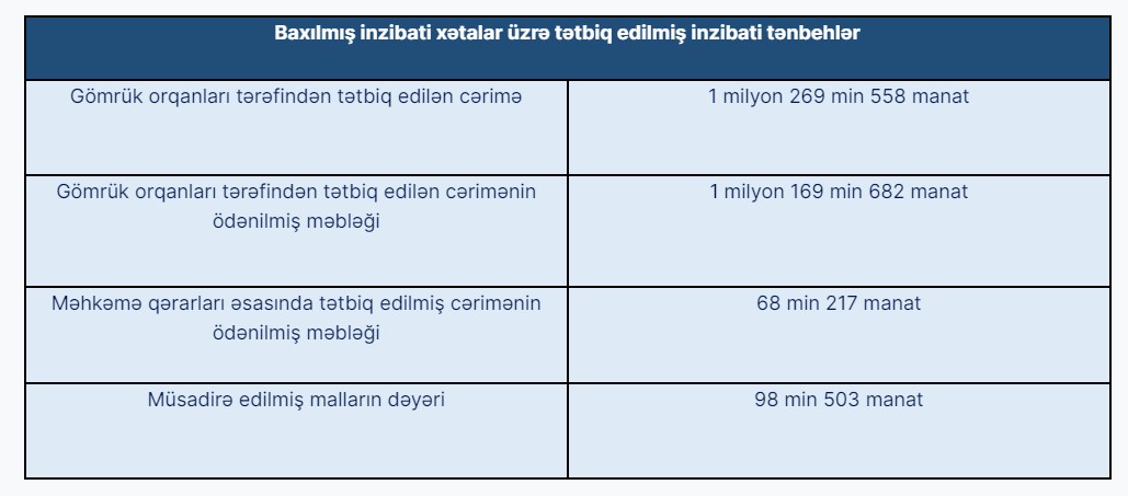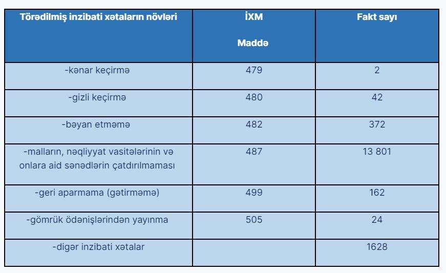 2024-cü ilin yanvar-iyun ayları ərzində Azərbaycan Respublikasının gömrük orqanları tərəfindən 15 975 inzibati xəta faktı aşkar edilmişdir. Bu faktlarla əlaqədar 1075 hüquqi şəxs (o cümlədən 468 xarici hüquqi şəxs) və 14894 fiziki şəxs (o cümlədən 4447 xarici vətəndaş) barəsində inzibati tənbeh tətbiq olunmuşdur.