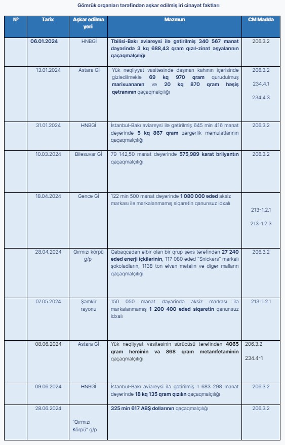 Marja.az məlumatlara istinadən xəbər verir ki, 2024-cü ilin yanvar-iyun ayları ərzində gömrük orqanları tərəfindən 16645 hüquqpozma faktı aşkar edilmişdir. Bu faktlardan 670-i cinayət xarakterli faktlar olmuşdur.