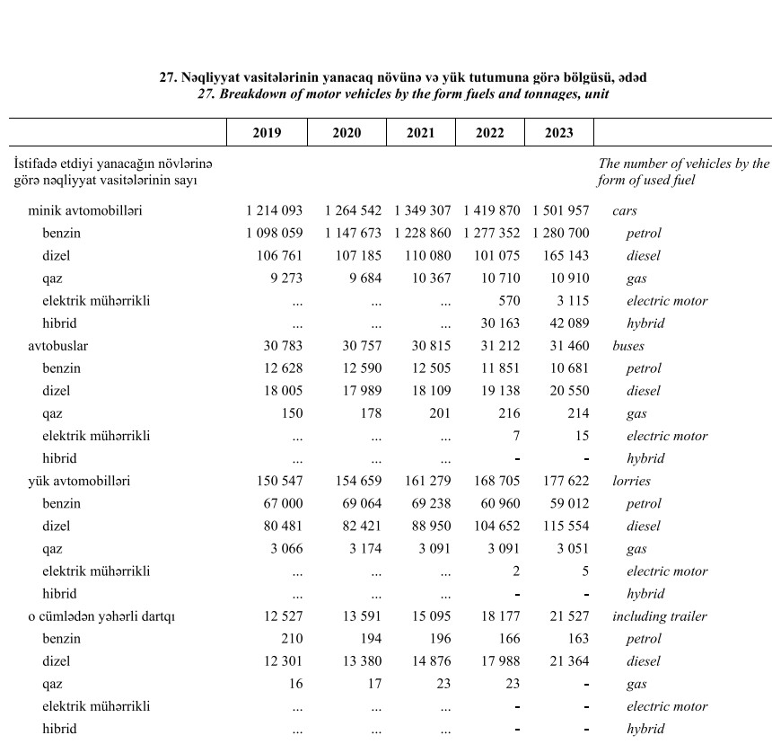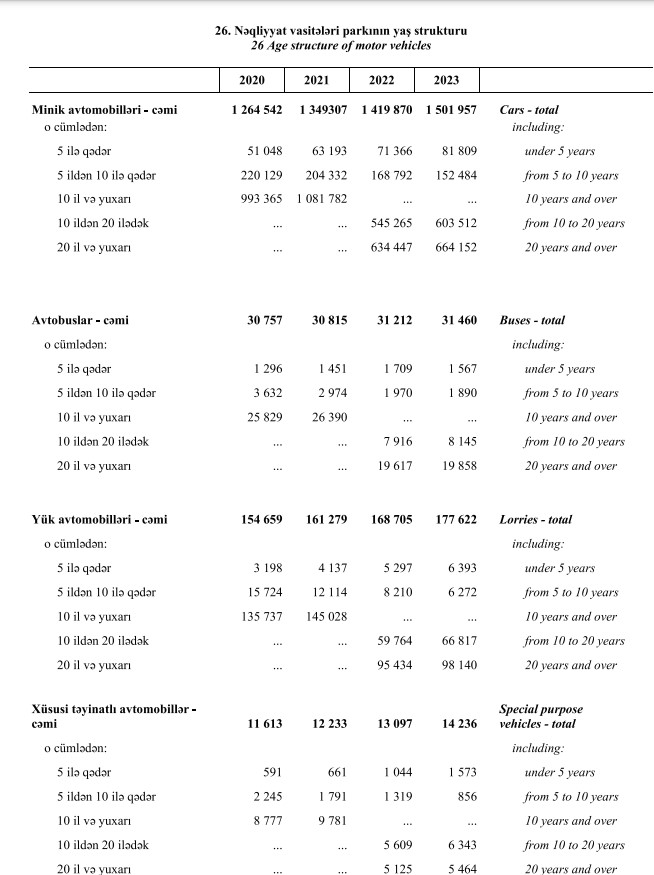 1 milyon 502 min ədəd minik avtomobilinin 1 milyon 267 min ədədinin yaşı 10 ildən yuxarıdır.2023-cü ilin sonuna olan məlumata görə, Azərbaycanda qeydiyyatda olmuş 1 milyon 501 min 957 ədəd minik avtomobilinin 1 milyon 267 min 664 ədəddinin və ya 84,4%-nin yaşı 10 ildən yüksəkdir.