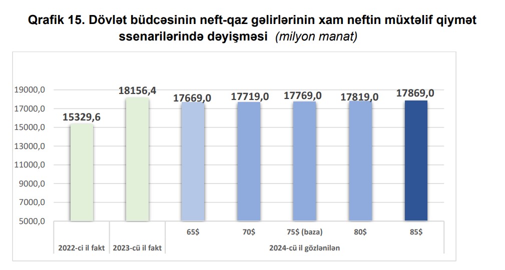 2024-cü ilin yenidən baxılan büdcəsində icmal büdcənin gəlirləri 43,5 milyard manat, o cümlədən icmal büdcənin neft-qaz gəlirləri 19,1 milyard manat proqnozlaşdırılır. Cari ilin altı aylıq faktiki daxilolmaları nəzərə alınmaqla, xam neftin qiymətinin hər 10 ABŞ dolları dəyişməsi icmal büdcənin gəlirləri təqribən 0,8 milyard manat artması və ya azalmasına səbəb olur.
