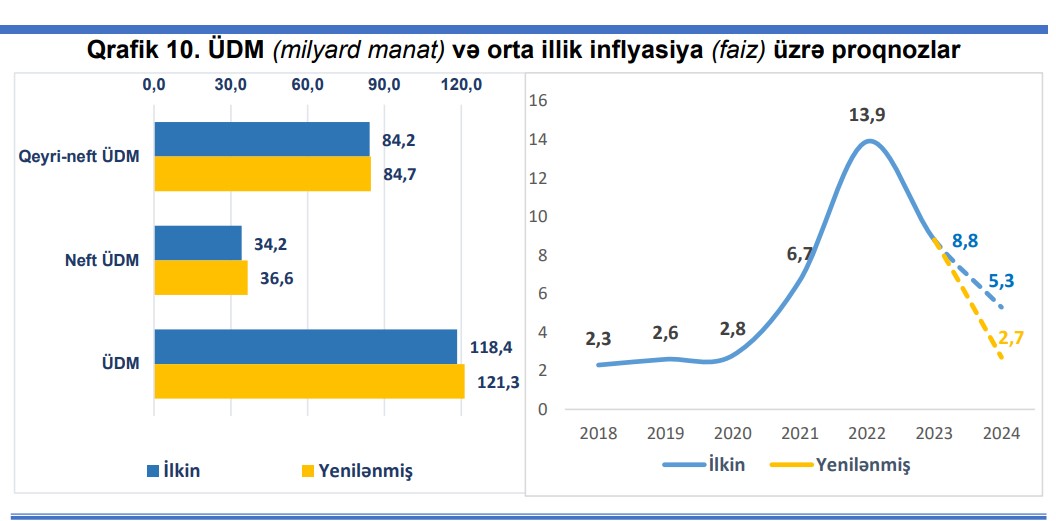 Eyni zamanda, 2024-cü ildə orta illik inflyasiya üzrə ilkin proqnoz 5,3 faiz səviyyəsində nəzərdə tutulsa da, yenidən baxılma ilə inflyasiya proqnozu 2,7 faizə qədər azaldılmışdır.