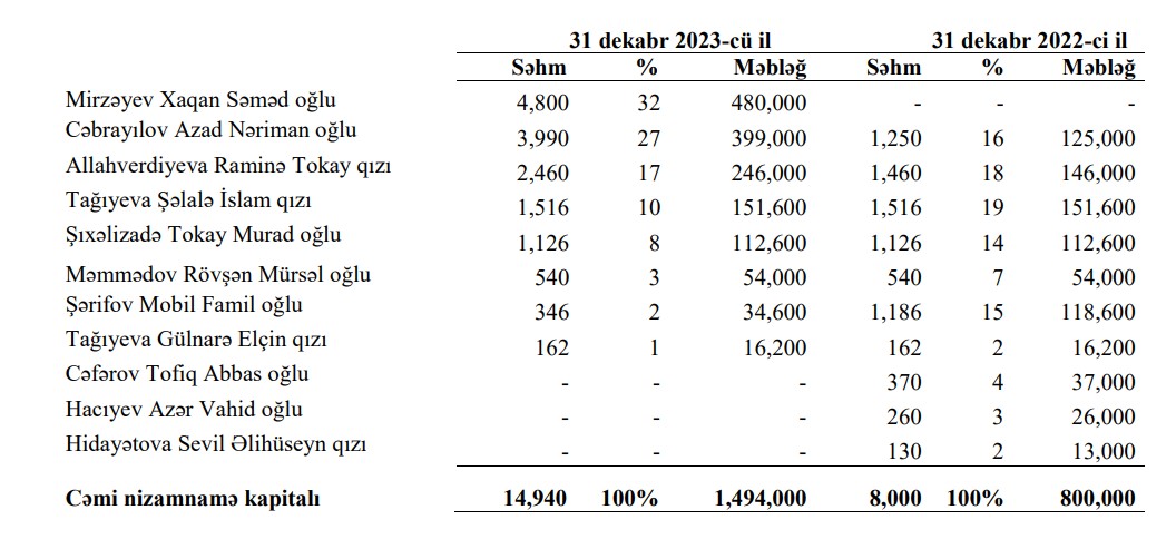 2023-cü ilin sonuna olan məlumata görə, “Finex Kredit” BOKT ASC-nin əsas təsisçiləri aşağıdakılardır: