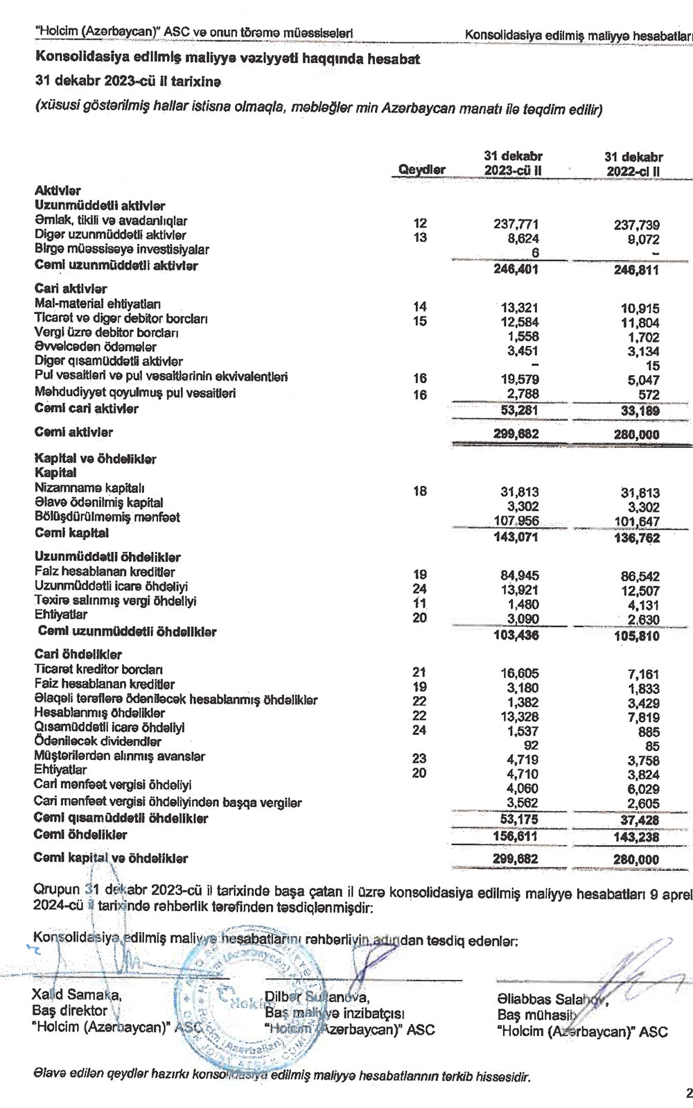 31 dekabr 2023-cü il tarixində "Holcim Azərbaycan" 299 milyon 682 min manat cəmi aktivlərə malik olub. Şirkət 2022-ci ilin sonunda 280 milyon manat cəmi aktivlərə malik idi.