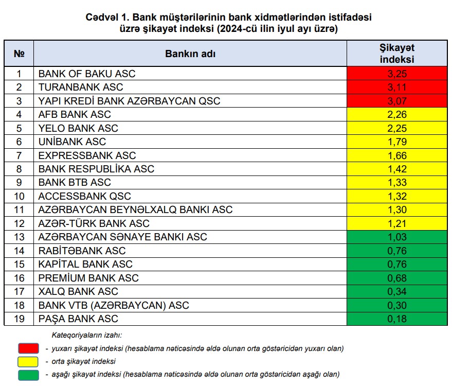 Yüksək şikayət indeksində isə BANK OF BAKU ASC, TURANBANK ASC və YAPI KREDİ BANK AZӘRBAYCAN QSC yer tutub.