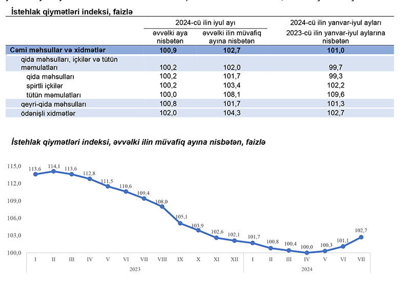 Xatırladaq ki, 2024-cü ilin iyun ayında istehlak qiymətləri indeksi 2023-cü ilin iyun ayına nisbətən 1,1 faiz, o cümlədən qida məhsulları, içkilər və tütün məmulatları üzrə 0,2 faiz, qeyriqida məhsulları üzrə 1 faiz, əhaliyə göstərilmiş ödənişli xidmətlər üzrə 2,4 faiz artmışdı. 2024-cü ilin iyun ayında istehlak qiymətləri indeksi əvvəlki aya nisbətən 0,1 faiz azalmış, yanvar-iyun aylarında isə əvvəlki ilin müvafiq dövrünə nisbətən 0,7 faiz yüksəlmişdi.