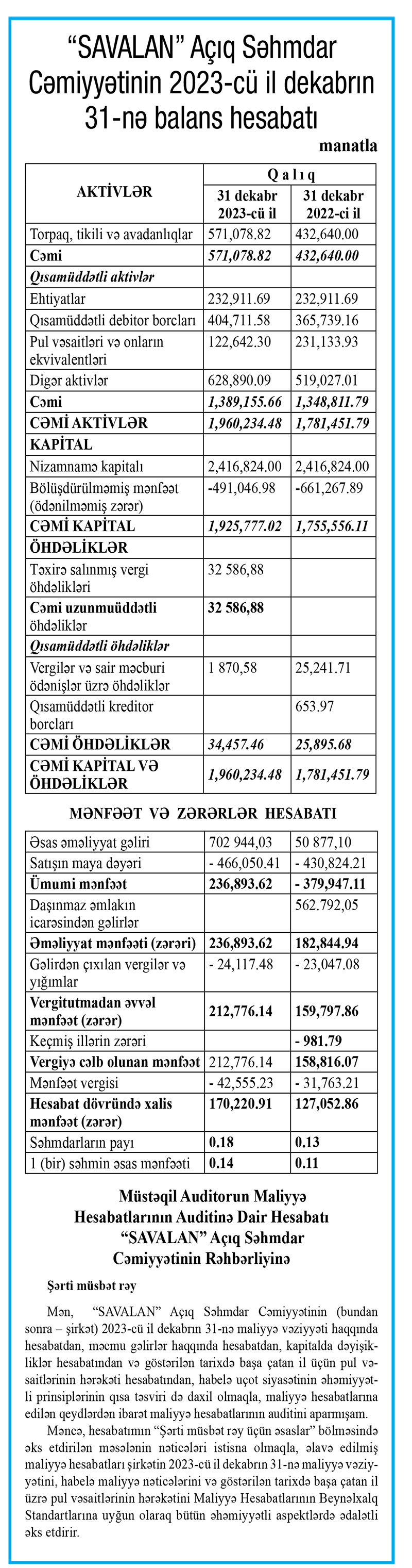 "Savalan" ASC 2023-ci ili 170 min manat xalis mənfəət ilə başa vurub. Şirkət 2022-ci ili 127 min manat xalis mənfəət ilə bağlamışdı. Diqqəti cəlb edən, ötən il "Savalan" ASC-nin daha çox icarədən deyil, satışdan gəlir əldə etməsidir.