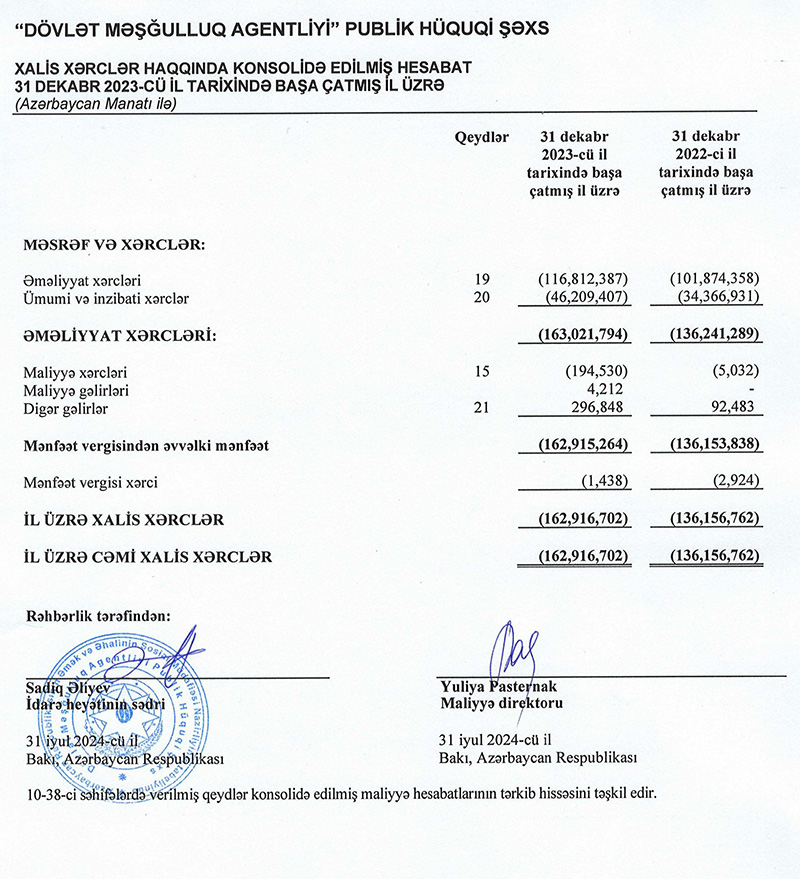 Hesabata görə, ötən il Dövlət Məşğulluq Agentliynin cəmi əməliyyat xərcləri 163 milyon 22 min manat, vergidən əvvəlki zərəri 162 milyon 915 min manat təşkil edib.