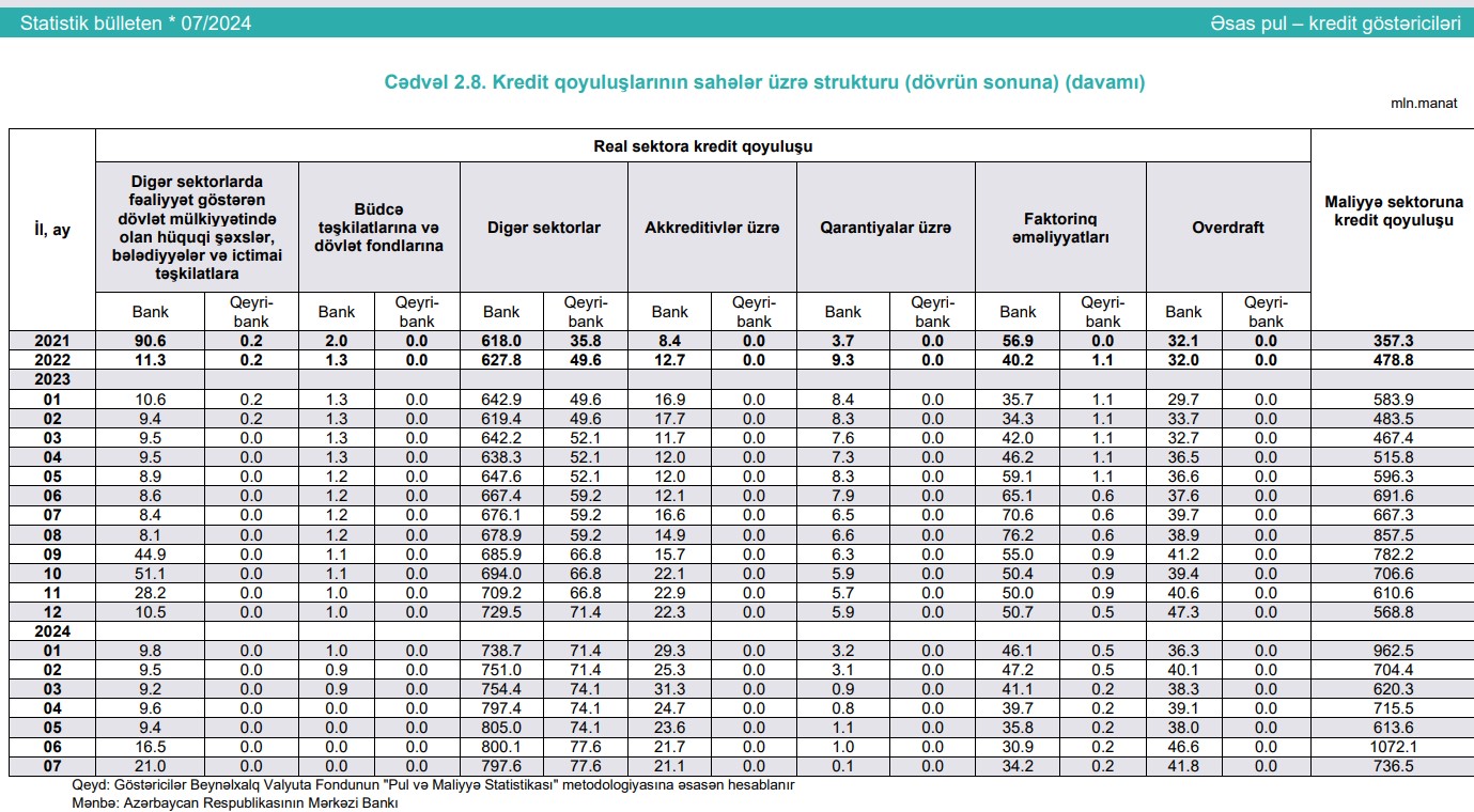 Ötən ilin sonu ilə müqayisədə qeyri-bank təşkilatlarının ev təsərrüfatları üzrə kredit portfeli 76,5 milyon manat artıb, iyul ayında isə dəyişməyib.