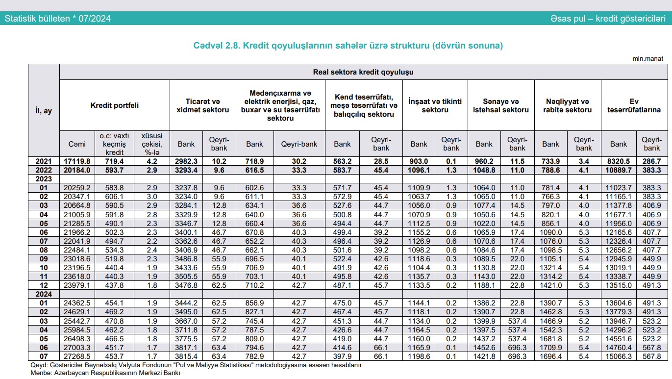 Ötən ilin sonu ilə müqayisədə bankların ev təsərrüfatları üzrə kredit portfeli 1 milyard 551,3 milyon manat, iyul ayında isə 305,9 milyon manat artıb