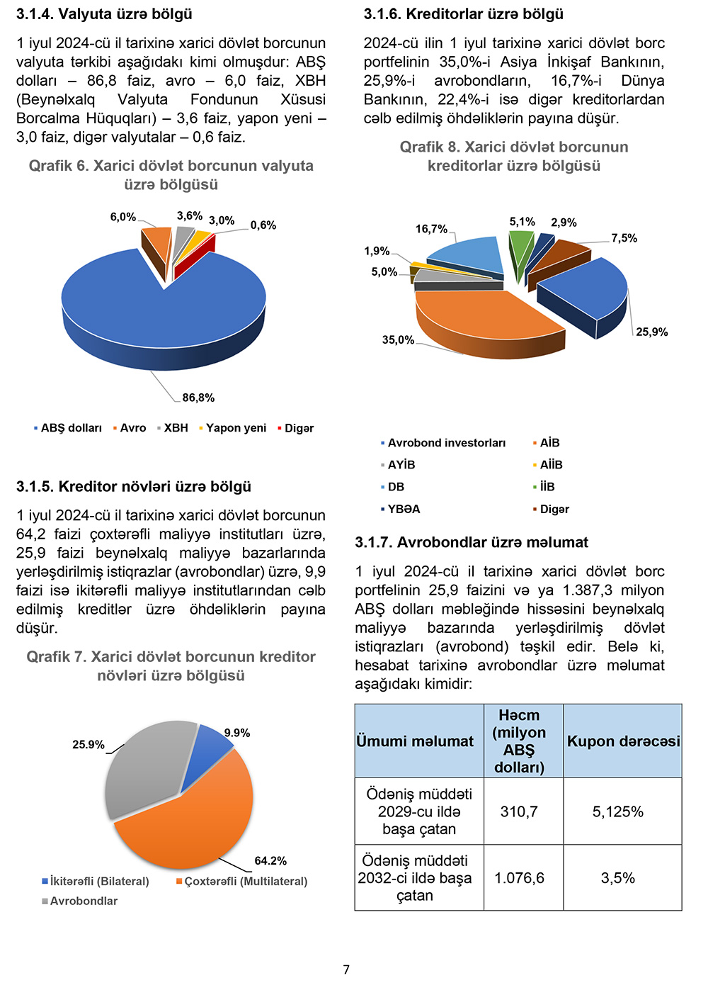1 iyul 2024-cü il tarixi vəziyyətinə xarici dövlət borcu 5 milyard 361,3 milyon ABŞ dolları və ya 2024- cü il üzrə 121 milyard 342,5 milyon manat (71 milyard 377,9 milyon ABŞ dolları) məbləğində proqnozlaşdırılan ÜDM-in 7,5 faizini təşkil etmişdir. 2024-cü ilin 1 iyul tarixinə xarici dövlət borcu ilin əvvəli ilə müqayisədə mütləq ifadədə 1 milyard 99,9 milyon ABŞ dolları və ya 17 faiz azalmışdır. Bunun da əsas səbəbi imzalanmış kredit sazişləri çərçivəsində 2024- cü ilin ilk altı ayı ərzində xarici dövlət borcu üzrə vaxtı çatmış əsas borc ödənişlərinin, o cümlədən beynəlxalq maliyyə bazarlarında 2014-cü ildə yerləşdirilmiş istiqrazlar (avrobond) üzrə 900 milyon ABŞ dolları məbləğində ödənişlərin həyata keçirilməsi olmuşdur. 2024-cü ilin 1 iyul tarixinə xarici dövlət borcunun ÜDM-ə nisbəti ilin əvvəli ilə müqayisədə 1,4 faiz bəndi azalmışdır.