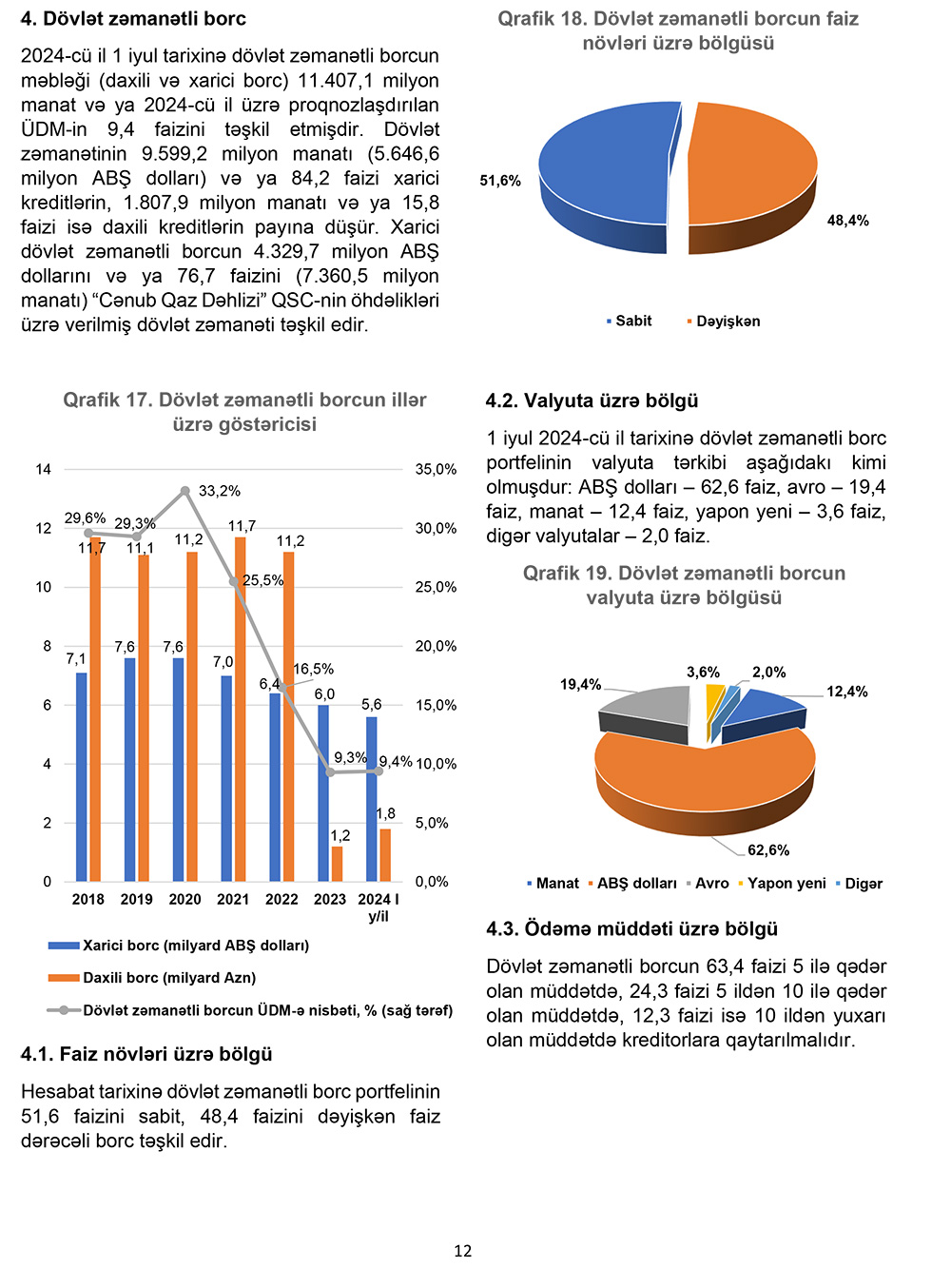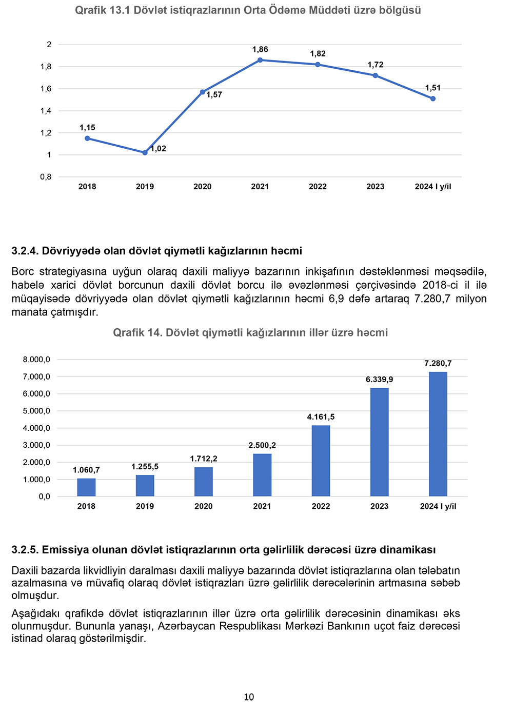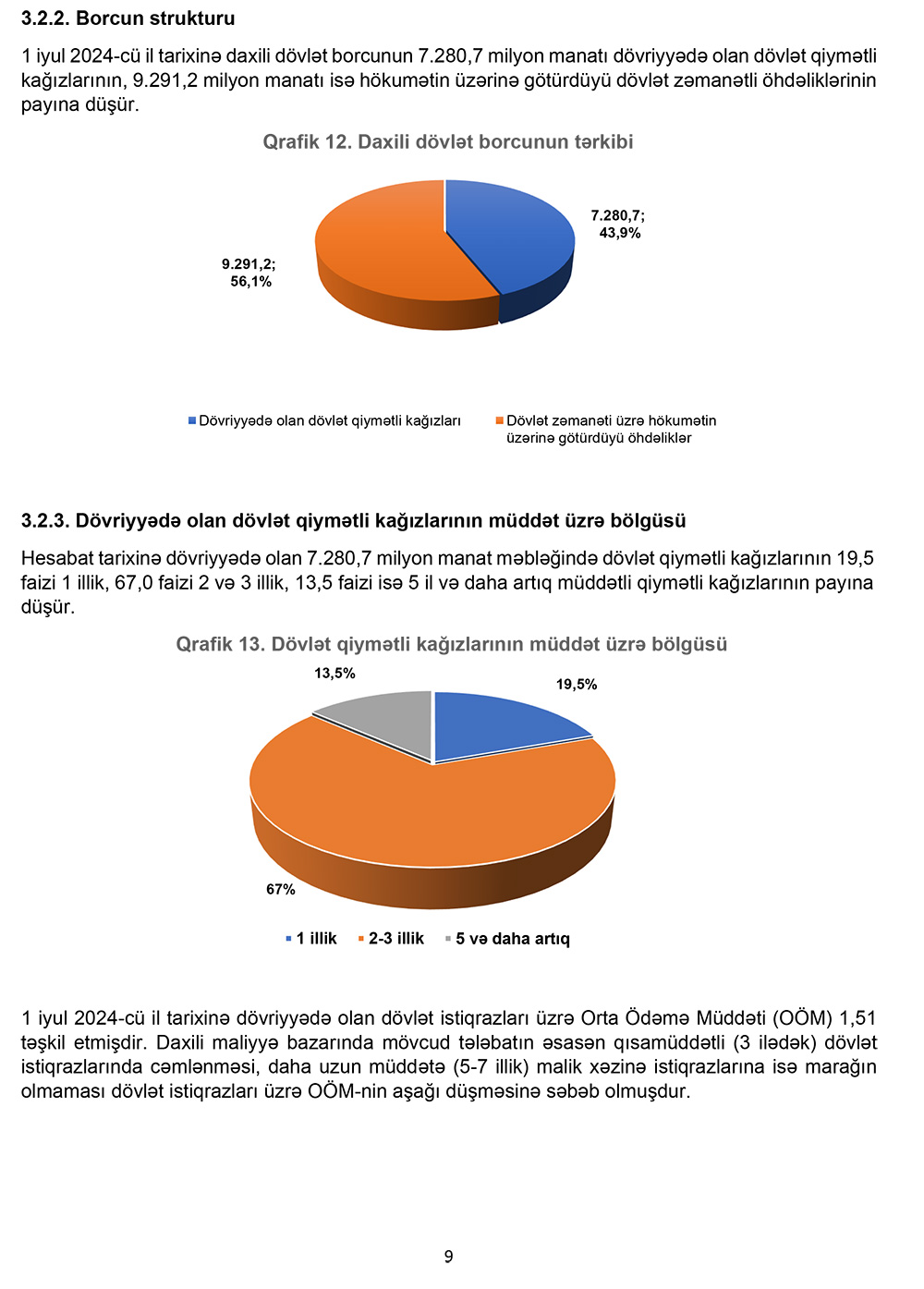 1 iyul 2024-cü il tarixinə daxili dövlət borcunun 7 milyard 280,7 milyon manatı dövriyyədə olan dövlət qiymətli kağızlarının, 9 milyard 291,2 milyon manatı isə hökumətin üzərinə götürdüyü dövlət zəmanətli öhdəliklərinin payına düşür.