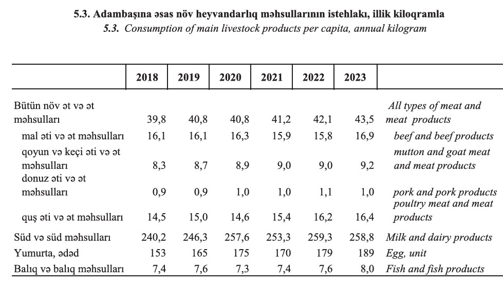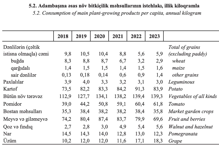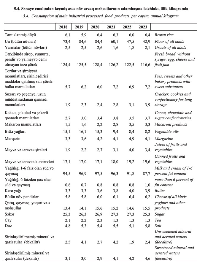Məcmuədə adambaşına ərzaq məhsullarının istehlakı barədə məlumatlar da yer alıb. Belə ki, Azərbaycanda adambaşına pomidor, üzüm, qoz, fındıq, ət və ət məhsulları, balıq və balıq məhsulları, yumurta istehlakı artıb.