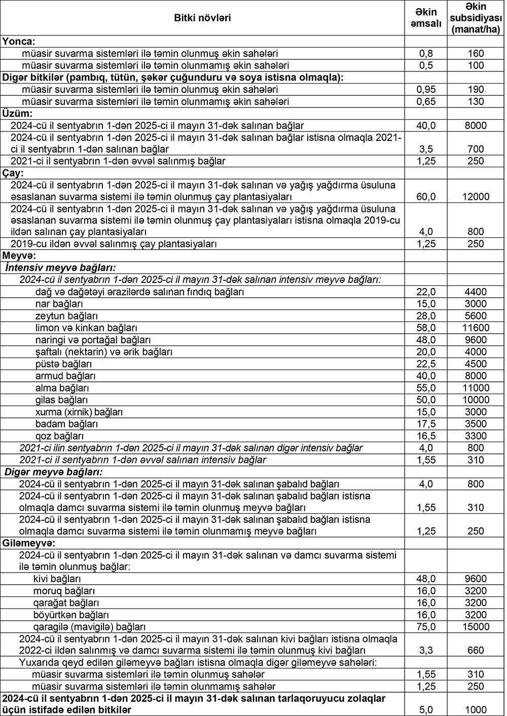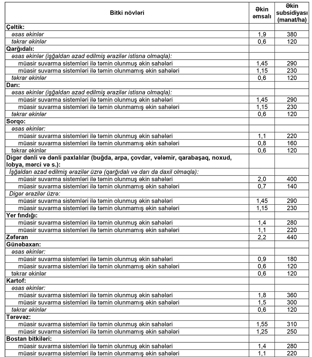 Qərara əsasən, baza məbləği 200 manat olmaqla 2025-ci ildə əkin əmsalları və əkin subsidiyasının məbləği kənd təsərrüfatı bitkiləri üzrə aşağıdakı kimi müəyyən olunub:
