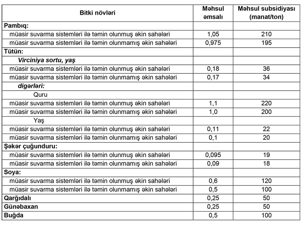 - Buğda üzrə məhsul əmsalı Azərbaycan Respublikasının Kənd Təsərrüfatı Nazirliyi ilə bağlanmış müqaviləyə əsasən müasir suvarma sistemlərinin tətbiq edildiyi təsərrüfatlarda ərzaqlıq buğda istehsalı ilə bağlı öhdəlik götürmüş şəxslər tərəfindən istehsal olunan, Azərbaycan Respublikasının Dövlət Ehtiyatları Agentliyinə və un dəyirmanlarına təhvil verilən ərzaqlıq buğdaya şamil edilsin, digər hallarda 0-a bərabər qəbul edilir.