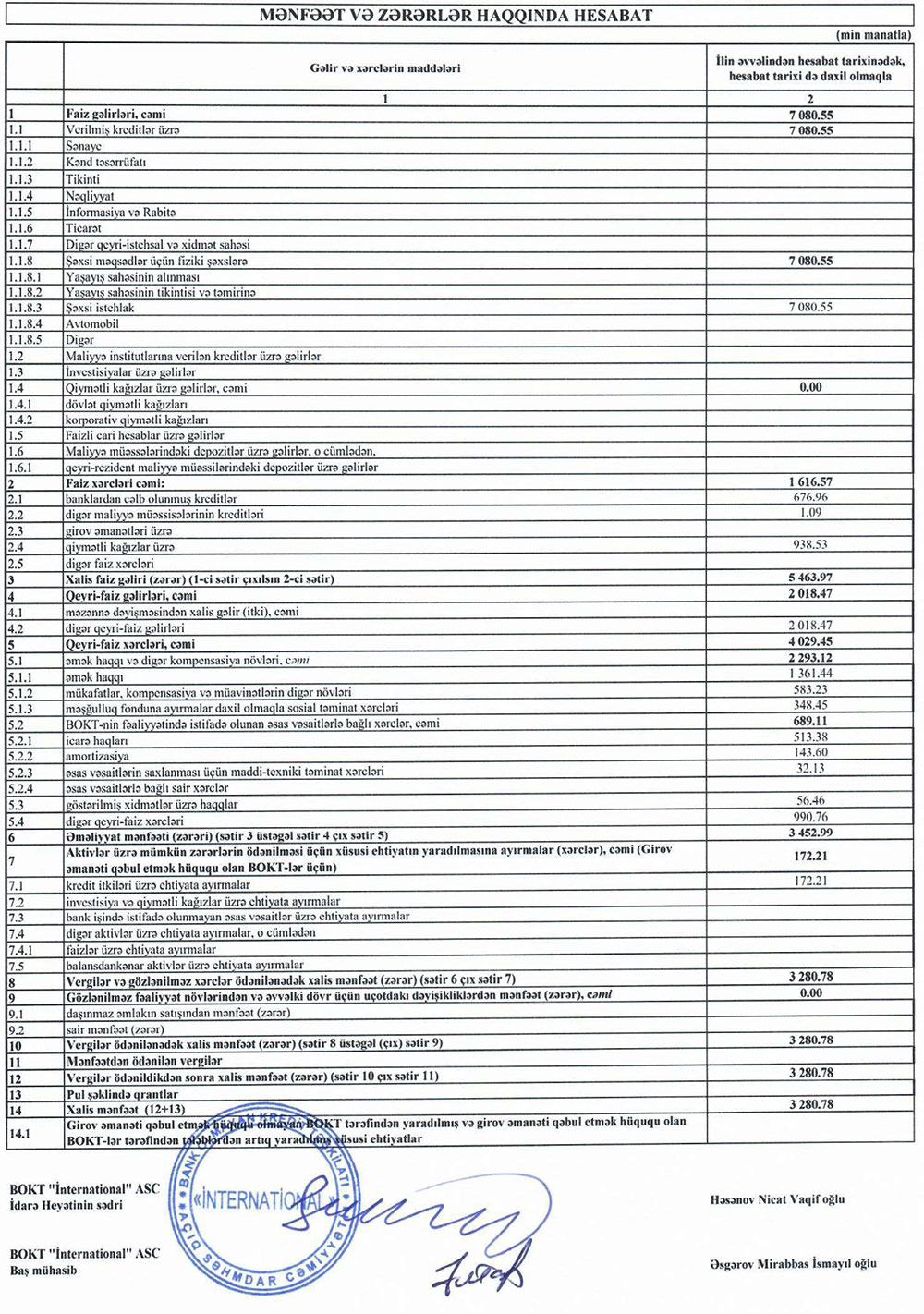 Bank Olmayan Kredit Təşkilatı (BOKT) "İnternational" ASC 2024-cü ilin birinci yarısını (yanvar-iyun) 3 milyon 281 min manat xalis mənfəət ilə başa vurub. Kredit təşkilatı 2023-cü ilin birinci yarısını 1 milyon 842 min manat xalis mənfəət ilə bağlamışdı. Beləliklə, BOKT "İnternational" ASC-nin xalis mənfəəti 2024-cü ilin birinci yarısında 2023-cü ilin birinci yarısı ilə müqayisədə 1,8 dəfə artıb. Xalis mənfəətin artması faiz və qeyri-faiz gəlirlərinin artmasından qaynaqlanır. HƏmçinin, aktivlər üzrə mümkün zərərlərin ödənilməsi üçün yaradılan ehtiyata ayrılan vəsaitin azalması da mənfəətə artırıcı təsir göstərib.