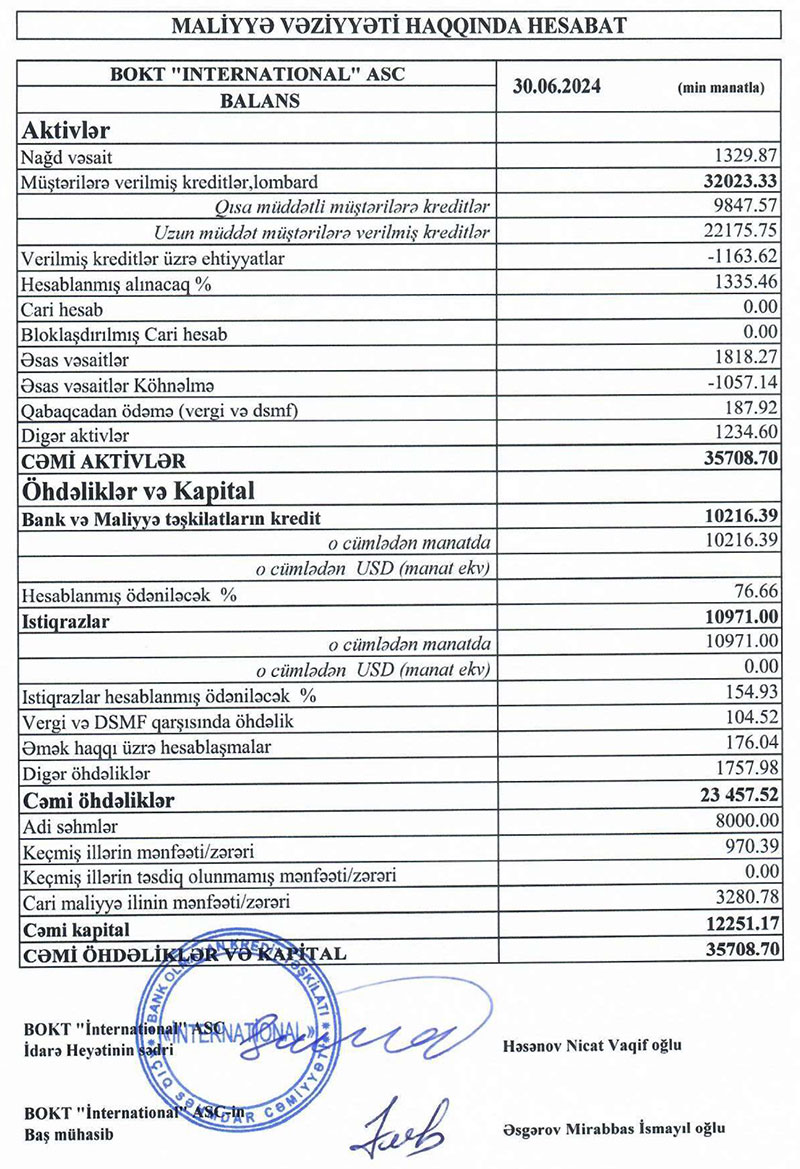 BOKT "İnternational" ASC-nin kredit portfeli (müştərilərə verilən kreditlər) 2023-cü ilin 30 İyun tarixi ilə müqayisədə 4 milyon 648 min manat və ya 17% artaraq 30 İyun 2024-cü il tarixində 32 milyon 23 min manata çatıb.