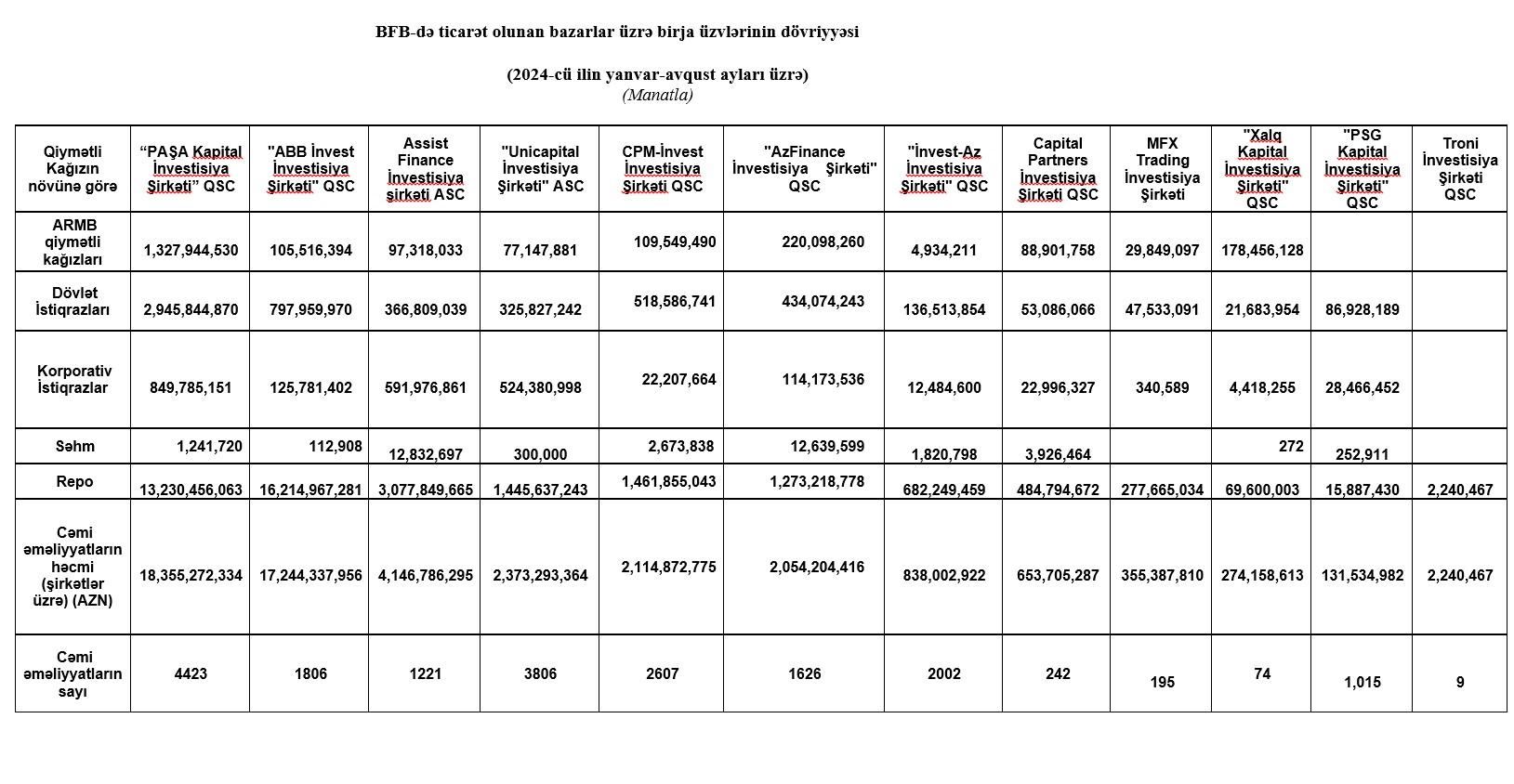 Bakı Fond Birjası (BFB) 2024-cü ilin yanvar-avqust ayları üzrə birjada ticarət olunan bazarlar üzrə birja üzvlərinin dövriyyələrini açıqlayıb.