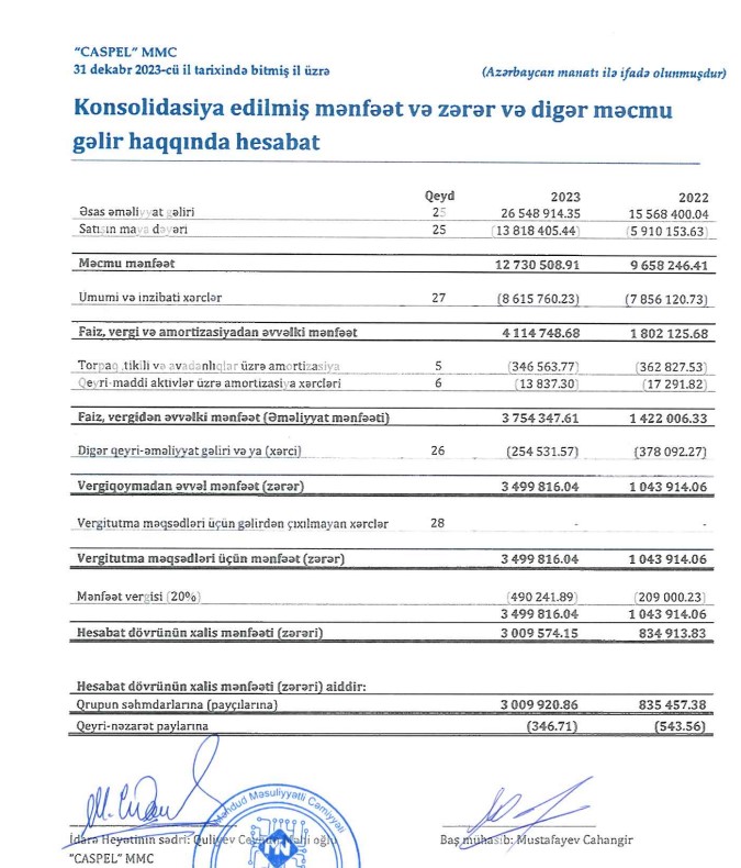 Marja.az Şirkətin konsolidə edilmiş maliyyə hesabatına istinadən xəbər verir ki, "Caspel" MMC-nin əsas əməliyyat gəliri 2022-ci ildə 15 milyon 568 min manat ikən, 2023-cü ildə 26 milyon 549 min manata yüksəlib (10 milyon 981 min manat və ya 70,5% artıb).