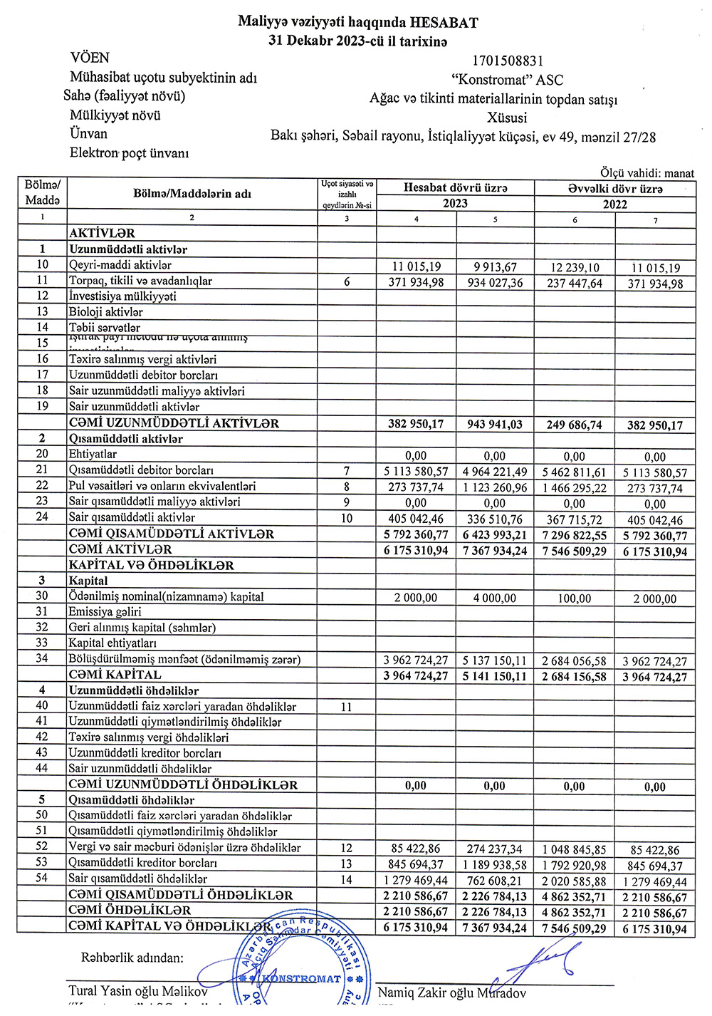 31 dekabr 2023-cü il tarixində "Konstromat" ASC 6 milyon 175 min manat cəmi aktivlərə, 3 milyon 965 min manat cəmi kapitala malik olub.