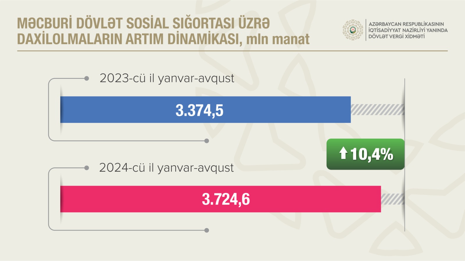 Qeyd edilib ki, 2024-cü ilin yanvar-avqust ayları ərzində muzdlu işçi sayının və əməkhaqqı fondunun “ağarması” prosesi şəraitində məcburi dövlət sosial sığorta haqları üzrə daxilolmalar 3 milyard 724,6 milyon manata yaxın təşkil edib. Bu mənbədən daxilolmalar əvvəlki ilin müvafiq dövrü ilə müqayisədə 10,4 faiz və ya 350 milyon manatdan çox artıb. Qeyri-büdcə təşkilatları üzrə daxilolmalar ötən ilin eyni dövrü ilə müqayisədə 13 faiz artaraq 2,5 milyard manata yaxın olub.