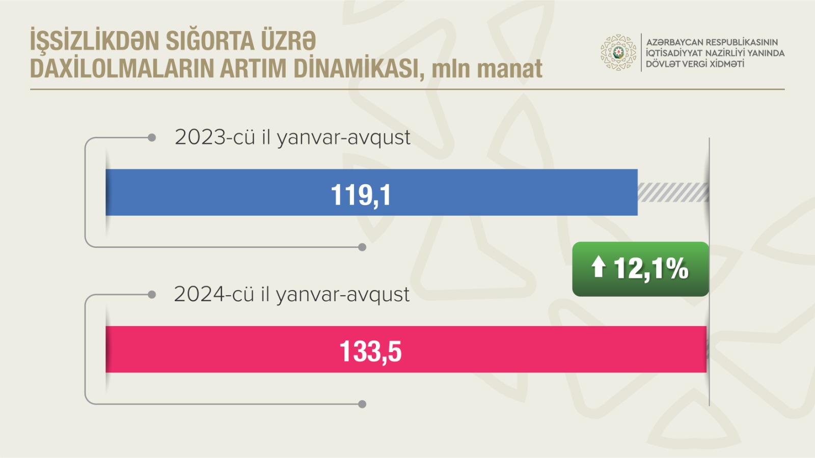 İşsizlikdən sığorta haqları üzrə daxilolmalar ötən ilin eyni dövrü ilə müqayisədə 12,1 faiz artaraq 133,5 milyon manat olub. Qeyri-büdcə təşkilatları üzrə daxilolmalar 14,6 faiz artaraq 100,8 milyon manat təşkil edib.