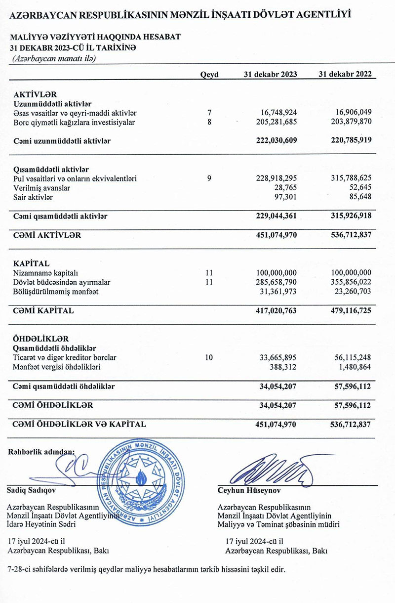 31 dekabr 2023-cü il tarixində Mənzil İnşaatı Dövlət Agentliyi 451 milyon 75 min manat cəmi aktivlərə malik olub. Agentlik 2022-ci ilin sonunda 536 milyon 713 min manat cəmi aktivlərə malik idi. Cəmi aktivlərin azalması dövlət büdcəsindən ayırmaların məbləğinin 70 milyon 197 min manat azalaraq 355 milyon 856 min manatdan 285 milyon 658 min manata geriləməsilə əlaqədardır.