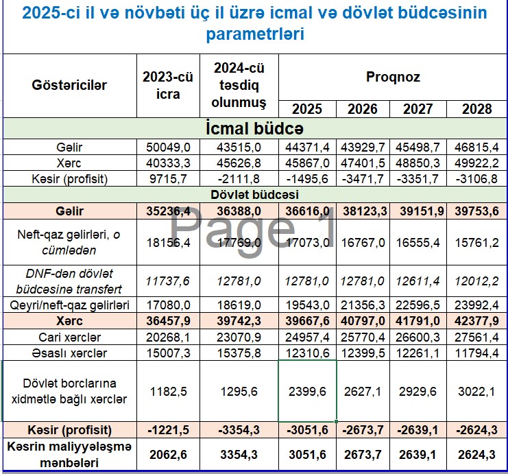 Qeyd edək ki, 2025-ci ildə dövlət büdcəsinin gəlirləri 36 milyard 616 milyon manat, xərcləri isə 39 milyard 667,6 milyon manat proqnozlaşdırılır. Gələn il 3 milyard 51,6 milyon manat büdcə kəsri (defisit) olacağı nəzərdə tutulur.