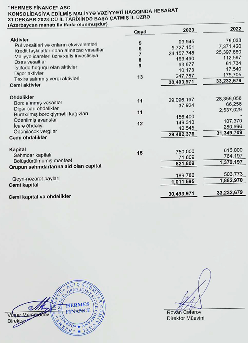 Ötən il "Hermes Finance"ın lizinq portfeli (maliyyə icarələri üzrə xalis investisiya) 1 milyon 241 min manat azalaraq 24 milyon 158 min manata geriləyib. 31 Dekbar 2023-cü il tarixində "Hermes Finance" 30 milyon 494 min manat cəmi aktivlərə malik olub. Şirkət 2022-ci ilin sonunda 33 milyon 233 min manat cəmi aktivlərə malik idi.