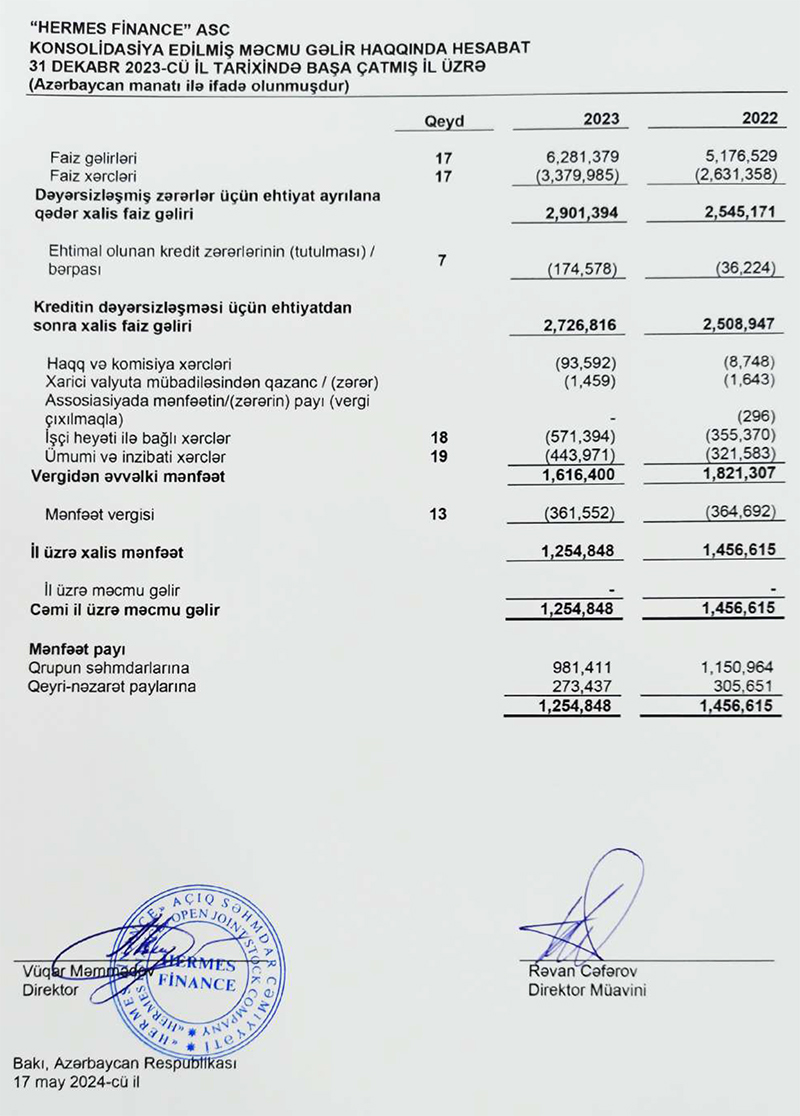 2023-cü ildə "Hermes Finance"ın 6 milyon 281 min manat gəlirinə qarşı, cəmi xərcləri 5 milyon 26 min manat təşkil edib. 2022-ci ildə Şirkətin gəliri 5 milyon 177 min manat, cəmi xərcləri 3 milyon 720 min manat təşkil etmişdi. Beləliklə, ötən il "Hermes Finance"ın gəlirinin 1 milyon 104 min manat artmasına qarşı xərcləri 1 milyon 306 min manat artıb. Bu səbəbdən Şirkətin xalis mənfəəti 202 min manat azalıb.