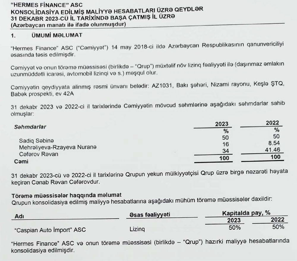 18 may 2018-ci il tarixində təsis edilmiş "Hermes Finance" ASC-nin səhmdarları Sadiq Səbinə (50%), Mehrəliyeva-Rzayeva Nuranə (16%) və Cəfərov Rəvandır (34%). Şirkətə son nəzarəti Rəvan Cəfərov həyata keçirir.