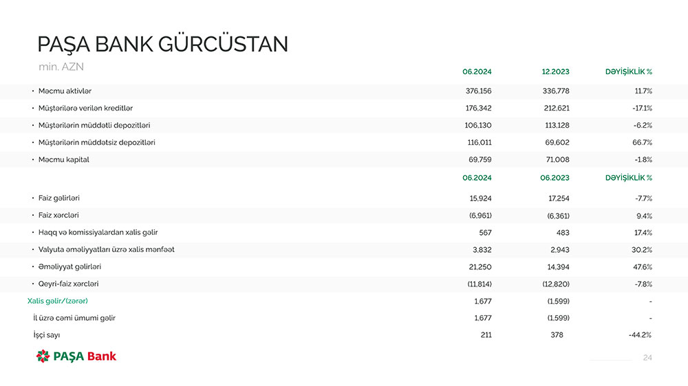 "PAŞA Bank Gürcüstan"ın profilinin dəyişdirilməsi Bankın maliyyə göstəricilərinin müsbətə doğru dəyişməsinə səbəb olub. Ötən ili 1 milyon 599 min manat xalis zərər ilə başa vurmuş Bank, 2024-cü ilin ilk 6 ayını 1 milyon 677 min manat xalis mənfəət ilə bağlayıb.