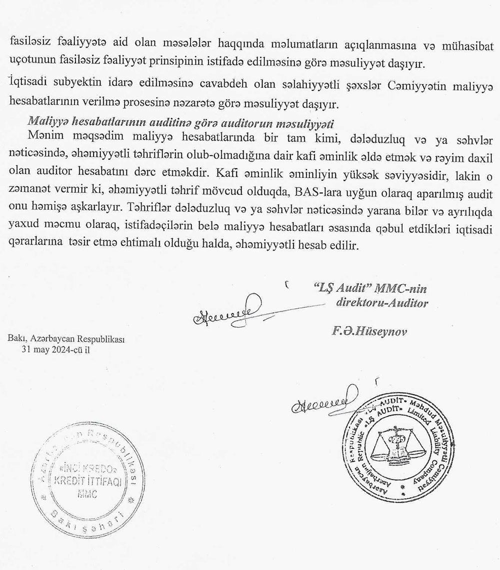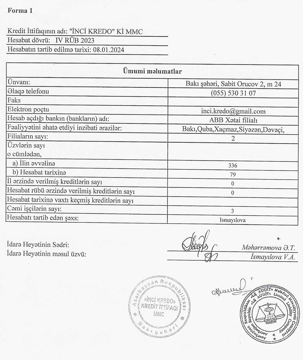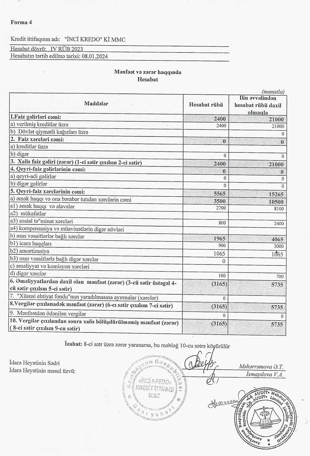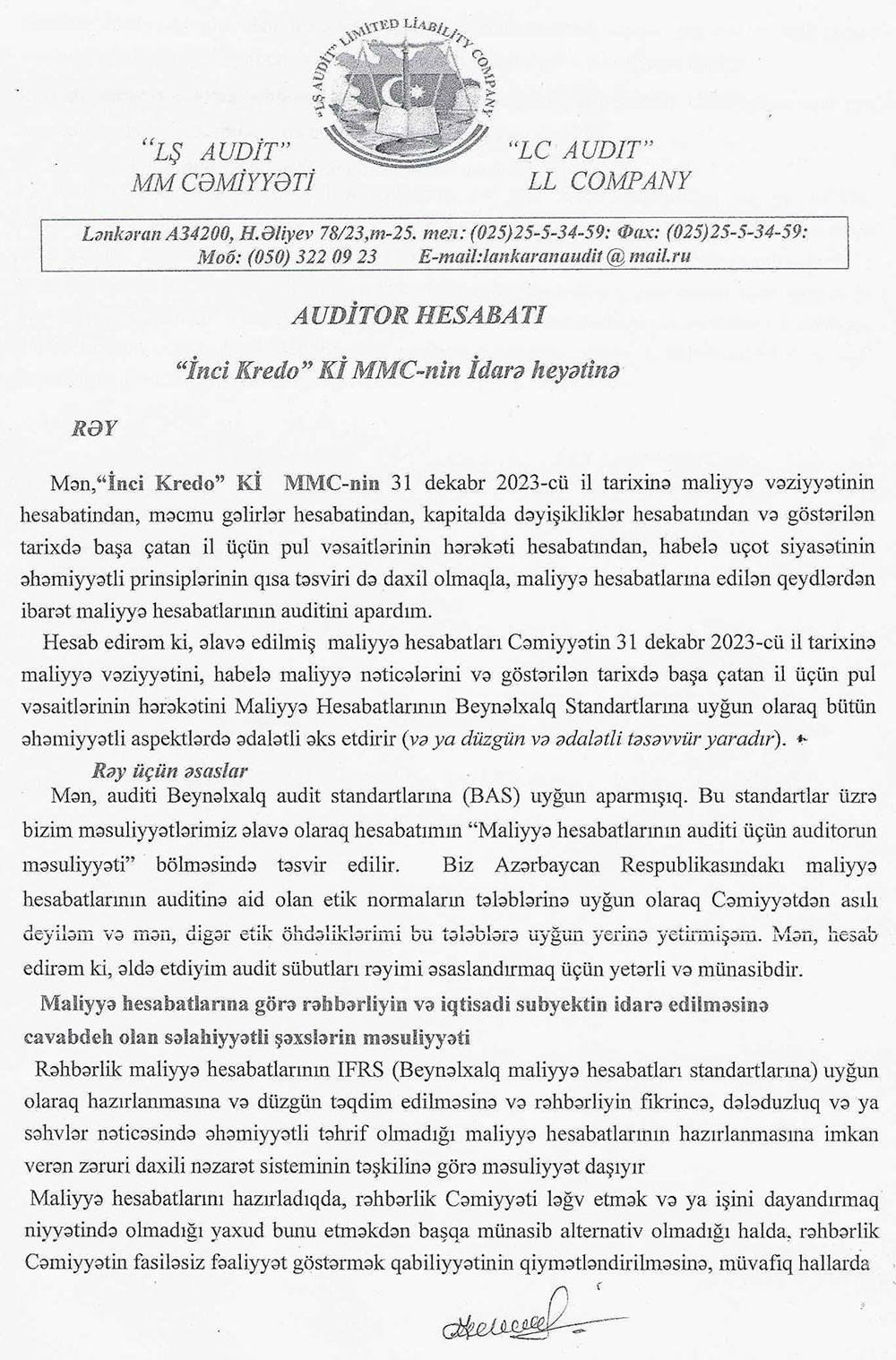 “İnci Kredo Kredit İttifaqı” MMC-nin 31 dekabr 2023-cü il tarixində başa çatan il üzrə maliyyə hesabatları.
