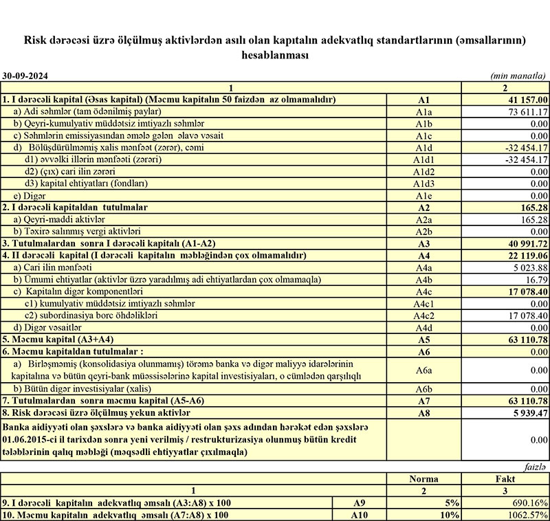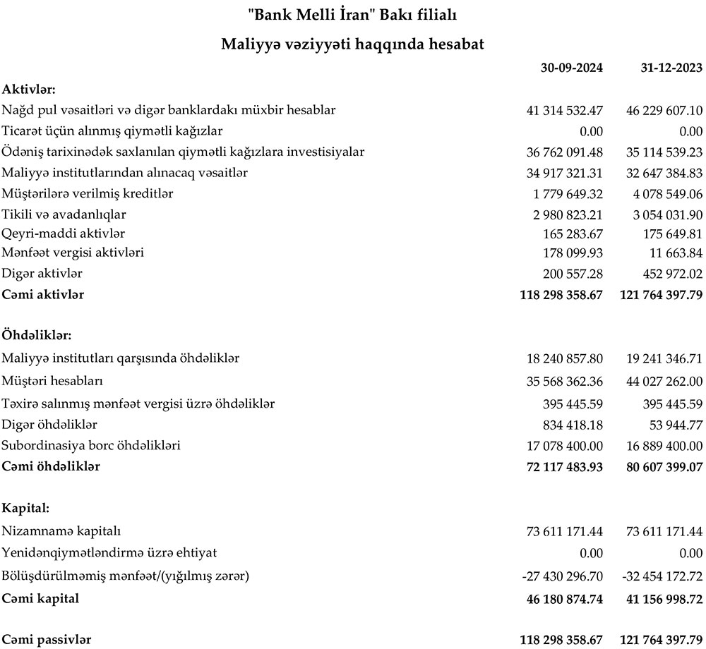 "Bank Melli İran" Bakı filialı 2024-cü ilin 9 ayını (yanvar-sentyabr) 5 milyon 24 min manat xalis mənfəət ilə başa vurub. Filial 2023-cü ilin eyni dövrünü 2 milyon 794 min manat xalis mənfəət ilə bağlamışdı. Beləkilə, "Bank Melli İran" Bakı filialının xalis mənfəəti 1,8 dəfə artıb. Artımın xeyli hissəsi (2 milyon 474 min manat) aktivlər üzrə yaradılmış ehtiyatdan qayıdan vəsait ilə əlaqədardır.