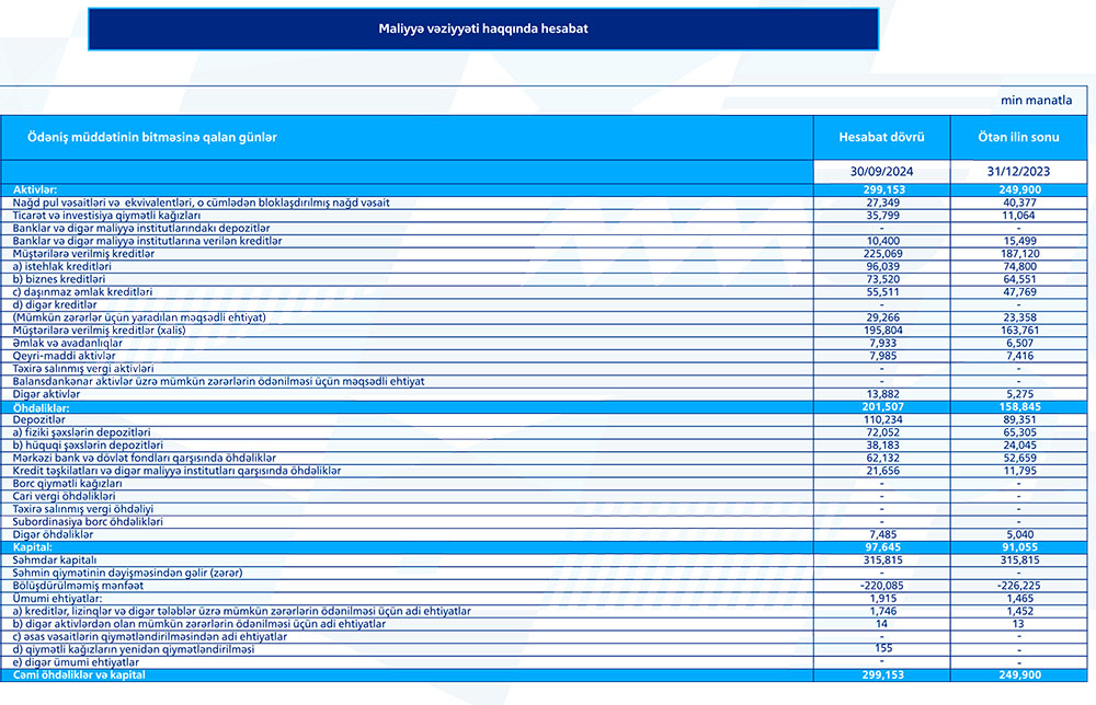 2024-cü ilin 9 ayı ərzində "Bank VTB (Azərbaycan)"da depozitlər 20 milyon 883 min manat və ya 23,4% artaraq 110 milyon 234 min manata qalxıb.