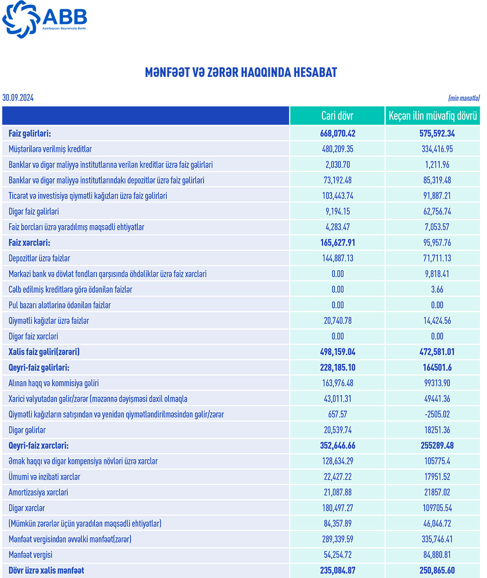 ABB (Azərbaycan Beynəlxalq Bankı) 2024-cü ilin 9 ayını (yanvar-sentyabr) 235 milyon 85 min manat xalis mənfəətlə başa vurub.