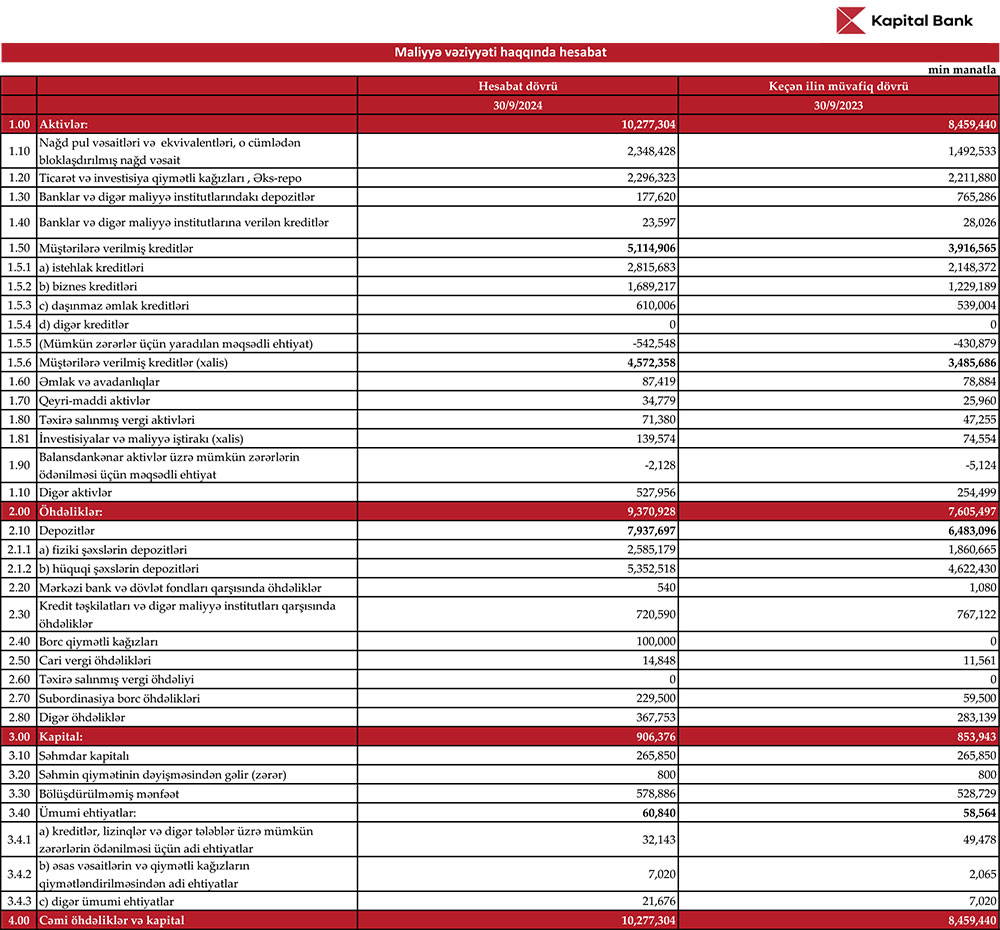 30 sentyabr 2023 - 30 sentyabr 2024-cü il dövründə "Kapital Bank"ın kredit portfeli (müştərilərə verilmiş cəmi kreditlər) 1 milyard 198 milyon 341 min manat və ya 30,6% artaraq 5 milyard 114 milyon 906 min manata çatıb.