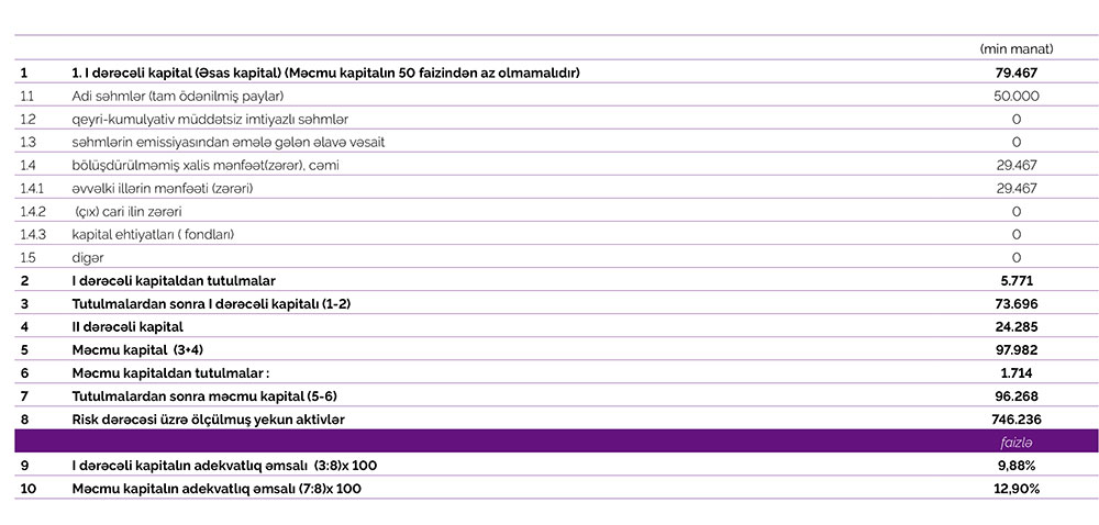 01 oktyabr 2024-cü il tarixində Bankın məcmu kapitalının həcmi 96,3 milyon manat olub.
