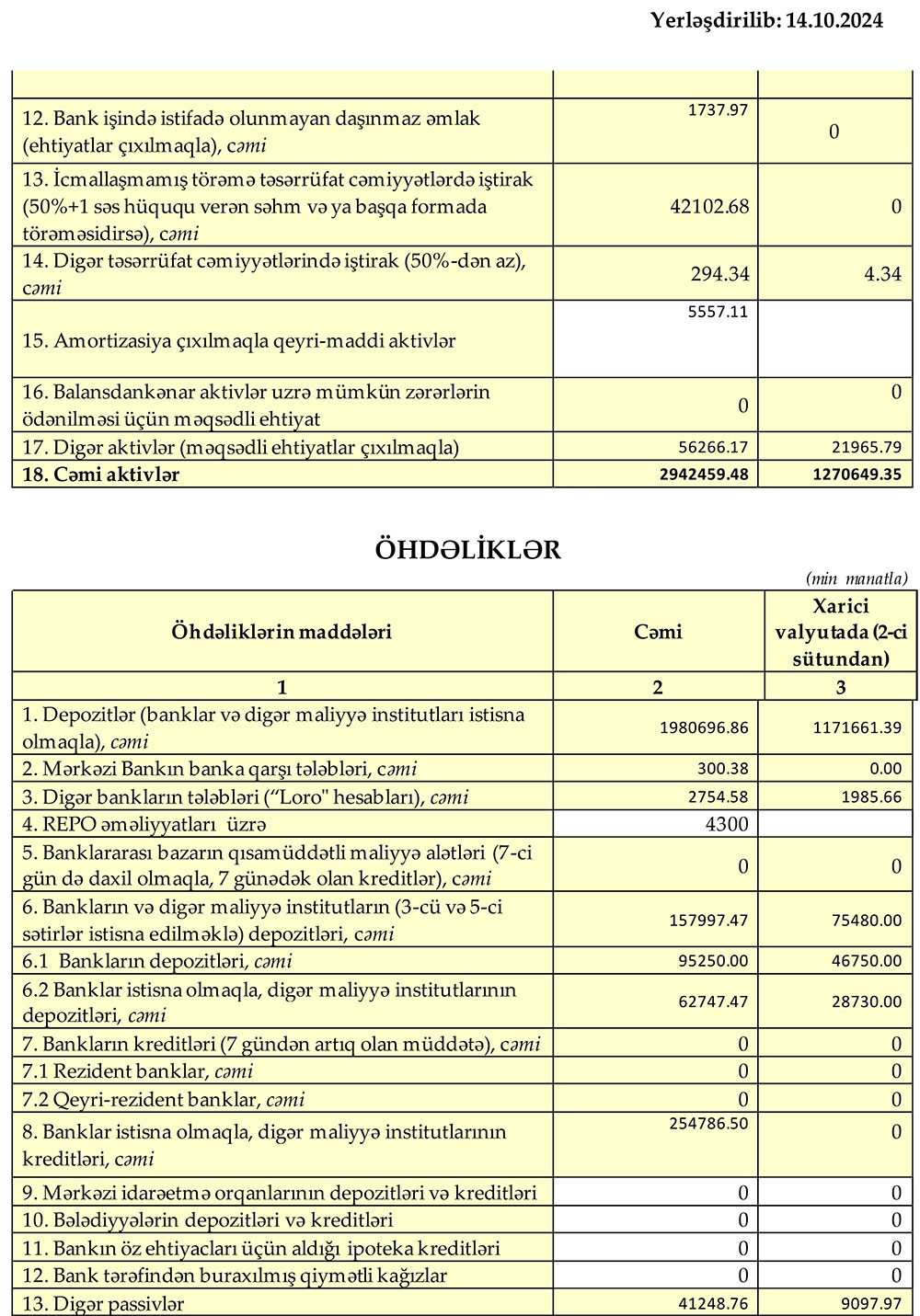 2024-cü ilin III rübünün sonuna Bankın xalis mənfəəti 54 milyon manat, cəmi kapitalı 500.4 milyon manat təşkil etmişdir. Hesabat dövrünün sonuna Bankın faiz gəlirləri ötən ilin analoji dövrünün sonu ilə müqayisədə 17.3%, yəni 20.1 milyon manat daha çox olmaqla 136.5 milyon manat, qeyri-faiz gəlirləri 56.8%, yəni 11.6 milyon manat artaraq 32.1 milyon manat təşkil etmişdir.