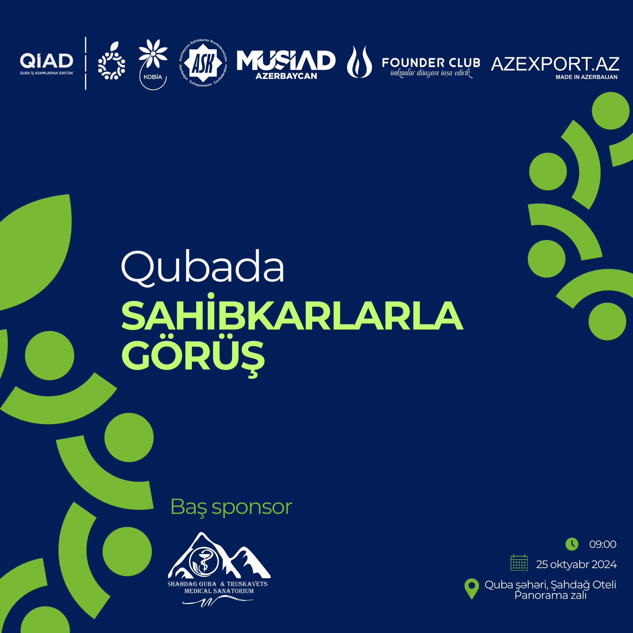 Qeyd edək ki, Quba İş Adamlarına Dəstək (QİAD) platformasının təşkilatçılığı, Kiçik və Orta Biznesin İnkişafı Agentliyinin (KOBİA), Azərbaycan Sahibkarlar Konfederasiyasının tərəfdaşlığı, MÜSİAD Azerbaycan, Founder Club, Azexport.az portalının təşkilati dəstəyi və "Şahdağ Quba Otel"in baş sponsorluğu ilə 25 Oktyabr 2024-cü il tarixində Qubada "Sahibkarlarla Görüş" və "Quba İş Adamlarına Dəstək" platformasının təqdimatı keçiriləcəkdir.