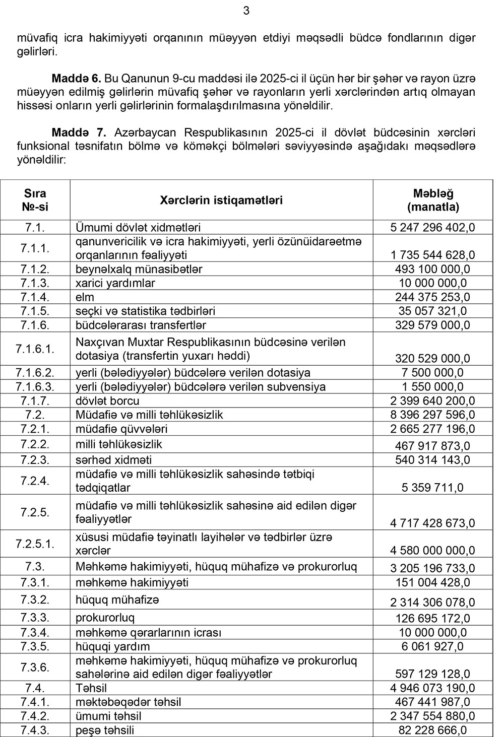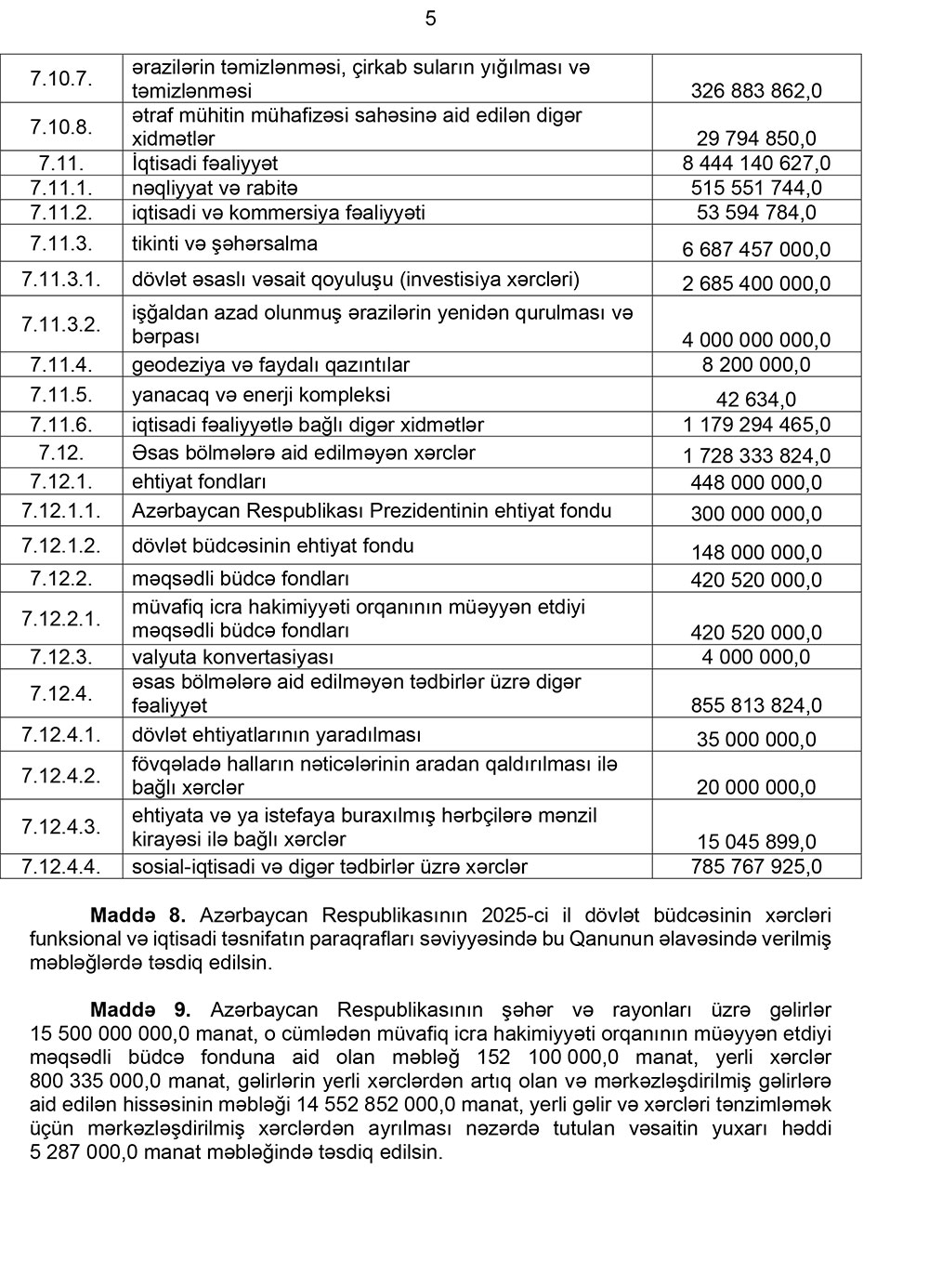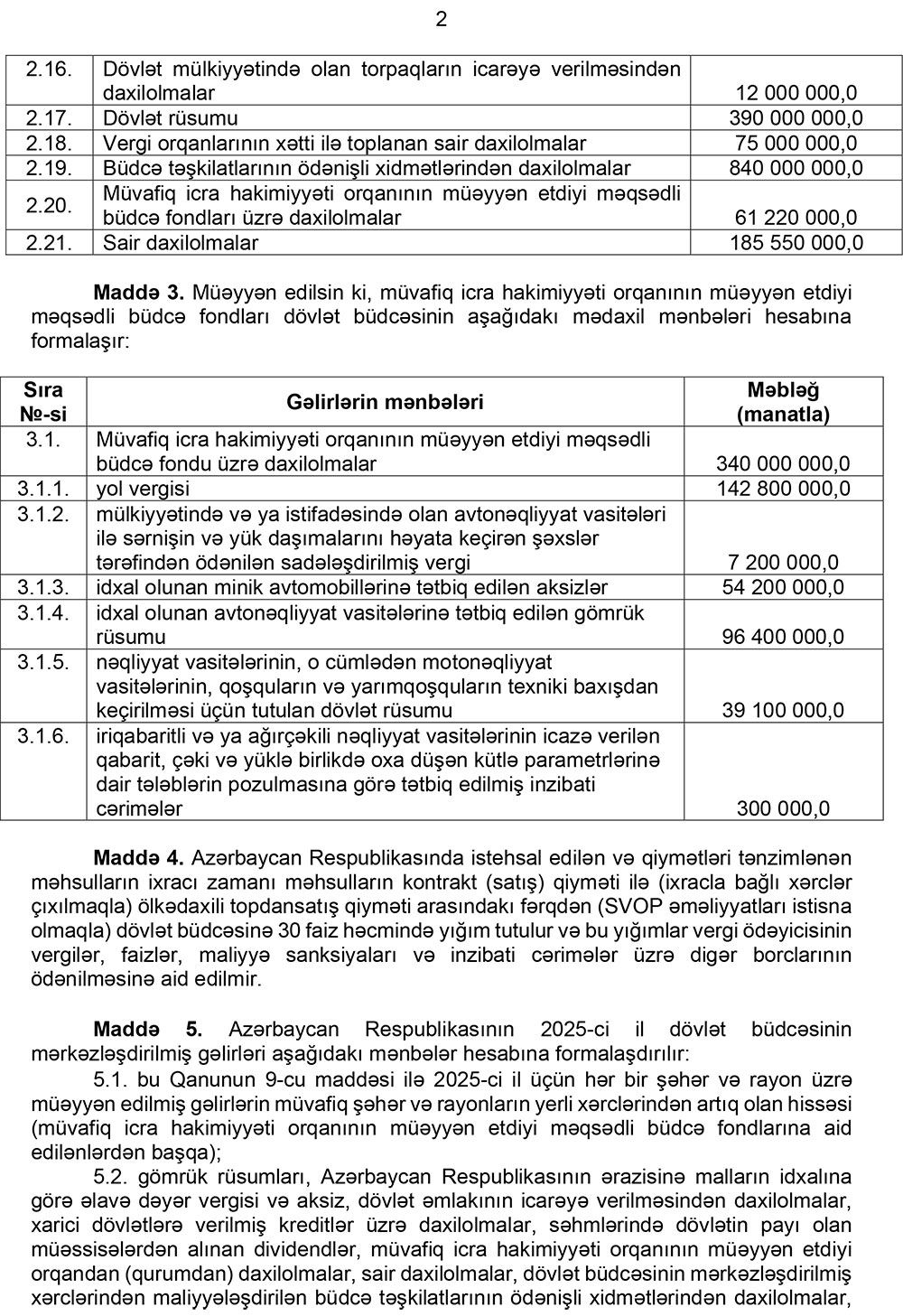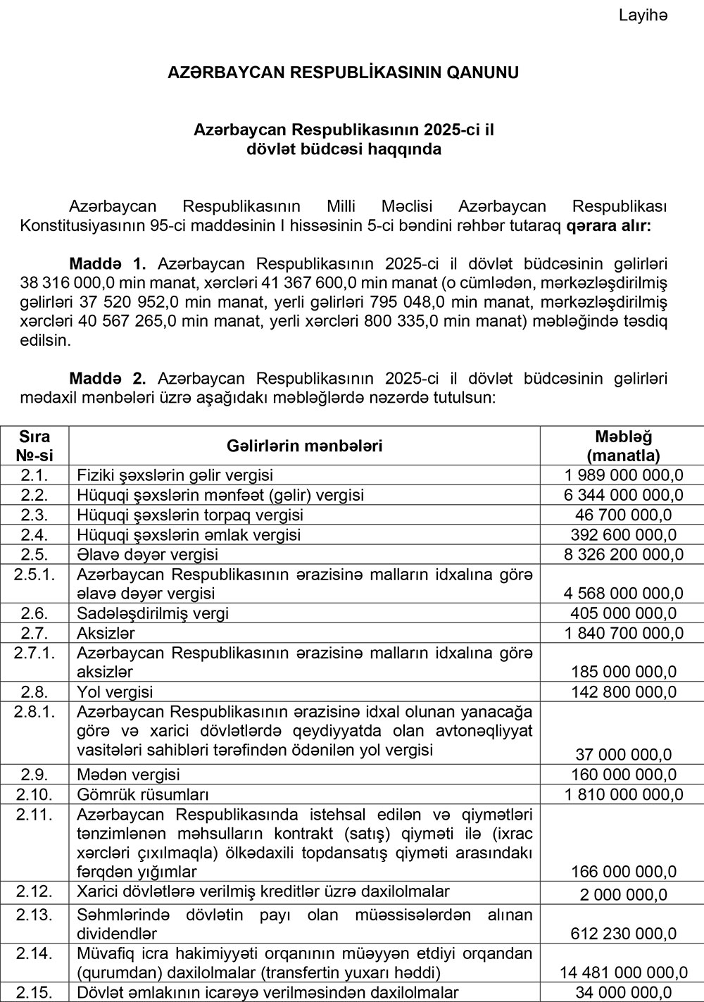 Azərbaycan Respublikasının 2025-ci il dövlət büdcəsinin gəlir proqnozu 36 milyard 616 milyon manatdan 38 milyard 316 milyon manata, xərc proqnozu isə 39 milyard 667,6 milyon manatdan 41 milyard 367,6 milyon manata yüksəldilib.Azərbaycanın 2025-ci il üçün dövlət büdcəsinin gəlir və xərcləri ilkin variantla müqayisədə 1,7 milyard manat artırılıb.