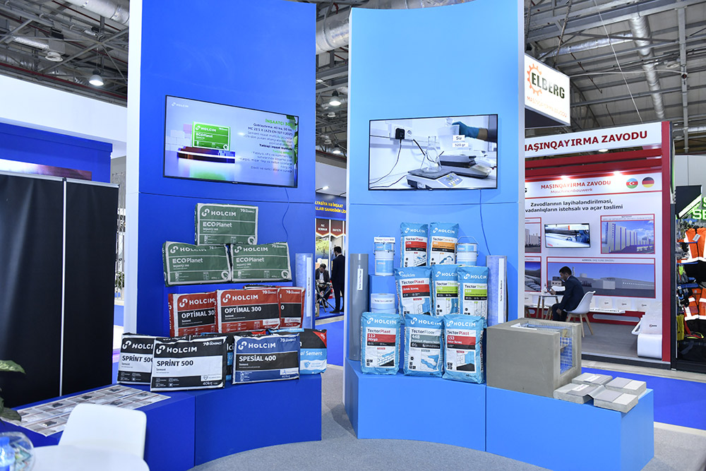 (®) Holcim Azərbaycan “Rebuild Karabakh” sərgisində ölkə daxilində müxtəlif tikinti layihələrinin ehtiyaclarını ödəmək üçün nəzərdə tutulmuş kisə sement məhsullarını təqdim edib. Bu innovativ məhsul xəttinə SPECIAL 400 çoxməqsədli sement, AQUASTOP tərkibli UNIKAL 400 və Azərbaycanda ilk addım olaraq sement istehsalında daha az CO₂ miqdarlı, ECOPlanet 300 daxildir.