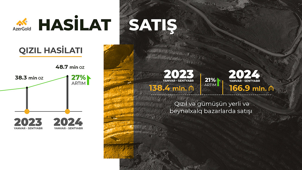 Həmçinin Səhmdar Cəmiyyət tərəfindən cari ilin ilk 9 ayı ərzində 40.2 min unsiya qızıl, 54.7 min unsiya gümüşün yerli və beynəlxalq bazarlarda satışı həyata keçirilib. Nəticədə ölkə iqtisadiyyatına ötən ilin eyni dövrü ilə müqayisədə 21% daha çox olmaqla 166.9 milyon manat vəsait cəlb edilib.