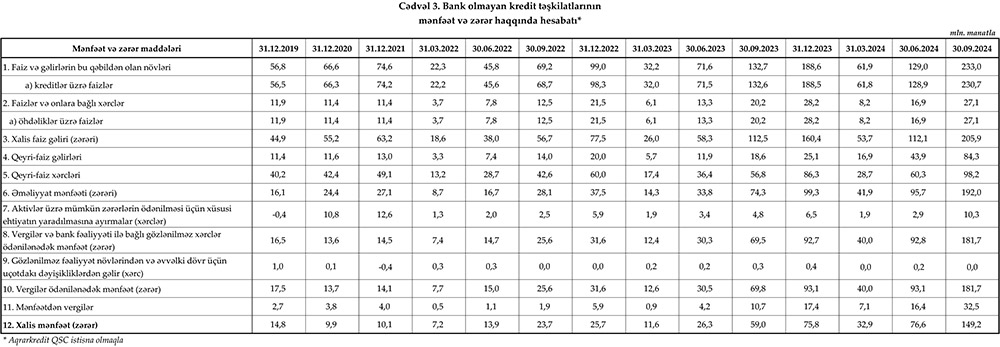 Azərbaycandakı bank olmayan kredit təşkilatları (BOKT) bu ilin yanvar-sentyabr aylarını 149,2 milyon manat xalis mənfəətlə başa vurub.