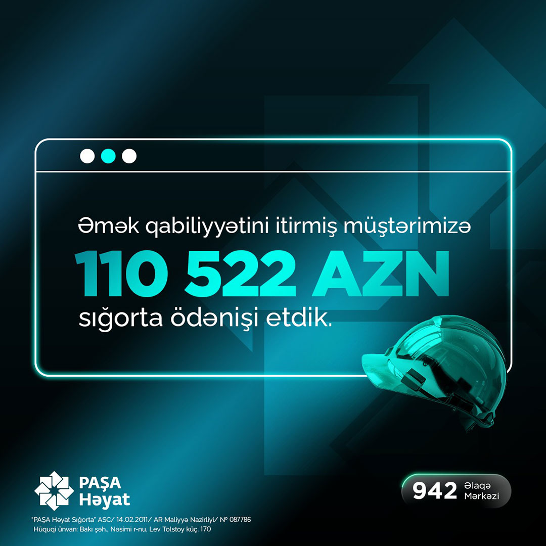 Əmək qabiliyyətinin 90%-ni itirmiş şəxsə 110 min 522 manat məbləğində birdəfəlik sığorta ödənişi verilib."PAŞA Həyat Sığorta" ASC istehsalatda bədbəxt hadisələr və peşə xəstəlikləri nəticəsində peşə əmək qabiliyyətinin itirilməsi hallarından icbari sığorta növü üzrə növbəti irihəcmli sığorta ödənişi həyata keçirib.