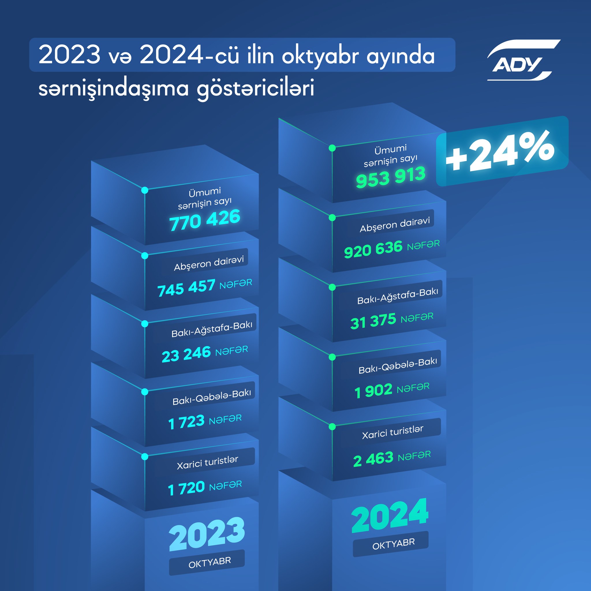 2023-cü və 2024-cü illərin oktyabr ayında daşınan sərnişin sayında isə bu il 24% artım qeydə alınıb.