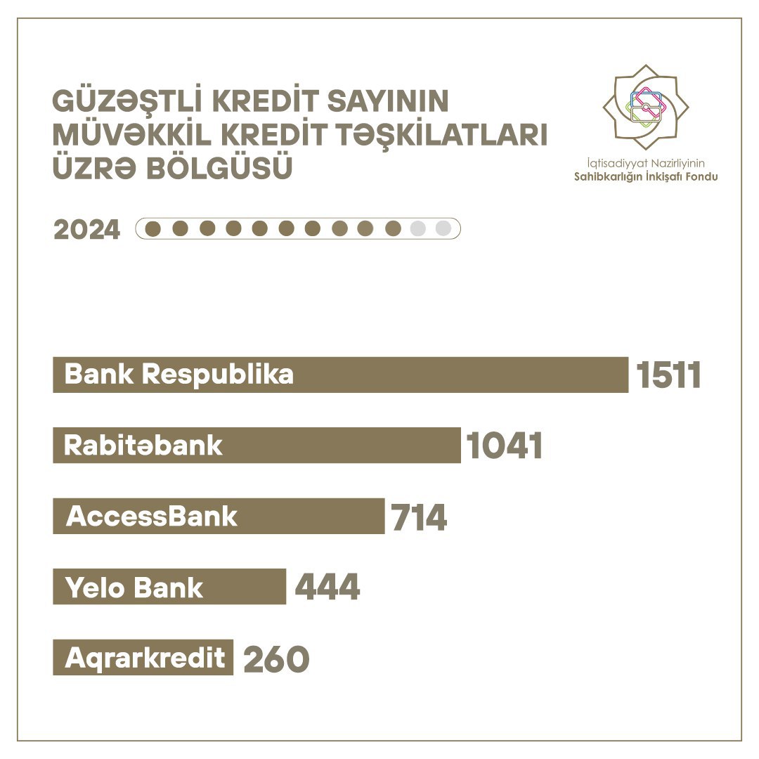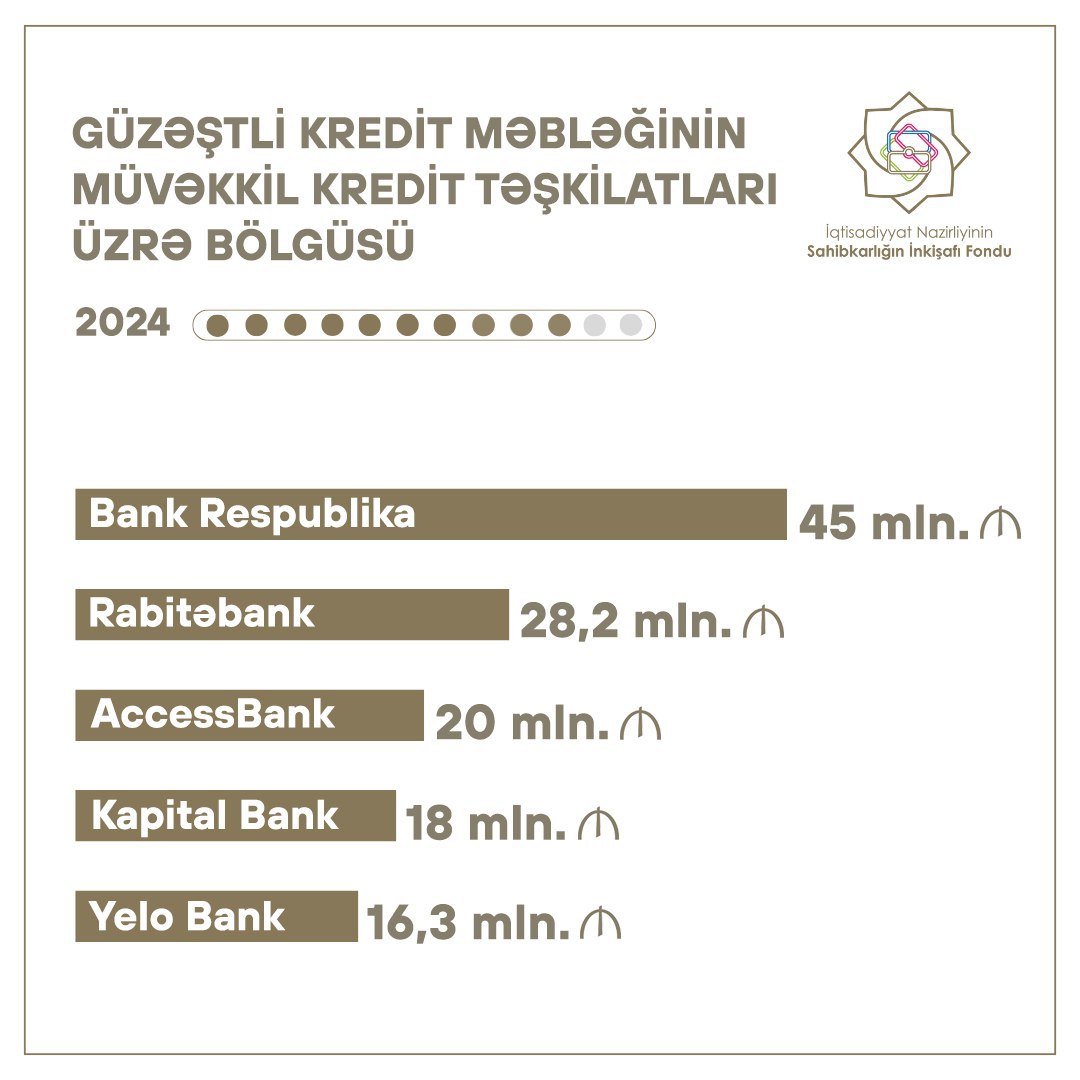 Sahibkarlara verilən güzəştli kreditlərin məbləği üzrə fərqlənən müvəkkil kredit təşkilatlarının siyahısına isə "Bank Respublika" (45 milyon manat), "Rabitəbank" (28,2 milyon manat), "AccessBank" (20 milyon manat), "Kapital Bank" (18 milyon manat) və "Yelo Bank" (16,3 milyon manat) daxildir.