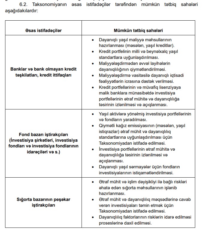 Taksonomiya həm maliyyə, həm də qeyri-maliyyə bazarı iştirakçıları və daha geniş maraqlı tərəflər üçün fəaliyyətin, layihənin, aktivin və ya portfelin Azərbaycan Respublikasının, eləcə də qlobal dünyanın ekoloji və dayanıqlılıq məqsədlərinə uyğunluğunu qiymətləndirmək və açıqlamaq üçün istiqamətləndirici çərçivə rolunu oynayır.