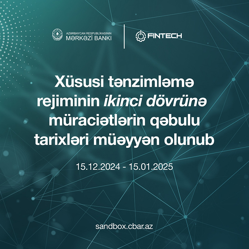 15 dekabr 2024-cü il tarixindən ikinci dövrdə iştirakla bağlı başlayacaq qəbulun 15 yanvar 2025-ci il tarixinədək davam etdirilməsi nəzərdə tutulub."Mərkəzi Bank “2024-2026-cı illərdə maliyyə sektorunun inkişaf Strategiyası” çərçivəsində maliyyə bazarlarında göstərilən maliyyə xidmətlərinin rəqəmsallaşdırılması, həmçinin yerli bazar üçün yeni innovativ maliyyə məhsullarının təqdim olunması və bununla da ölkəmizdə maliyyə inklüzivliyinin artırılması istiqamətində tədbirlərin həyata keçirilməsini davam etdirir. Maliyyə bazarlarında innovativ maliyyə məhsullarının məhdud çərçivədə və Mərkəzi Bankın nəzarəti altında sınaqdan keçirilməsi məqsədilə tətbiq edilən xüsusi tənzimləmə rejimi bu mühüm təşəbbüslər sırasındadır".