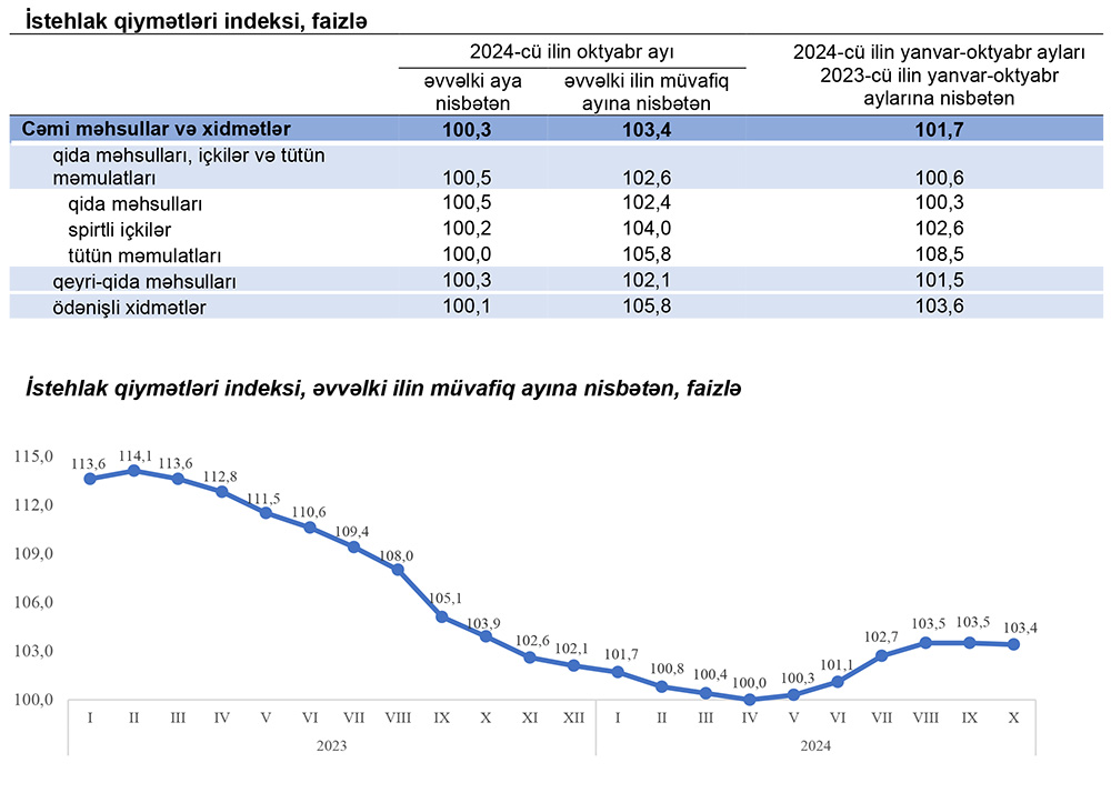 Dövlət Statistika Komitəsinin yaydığı məlumata görə, 2024-cü ilin oktyabr ayında istehlak qiymətləri indeksi əvvəlki aya nisbətən 0,3 faiz, yanvar-oktyabr aylarında isə əvvəlki ilin müvafiq dövrünə nisbətən 1,7 faiz yüksəlib.