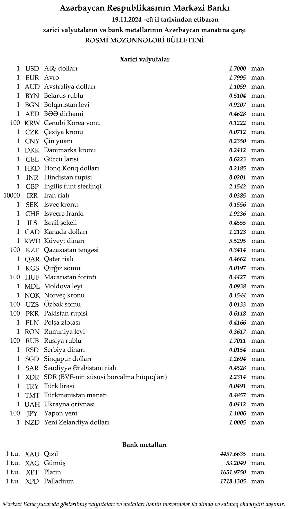 Dolların bazar ertəsi üçün rəsmi məzənnəsi müəyyən olunub